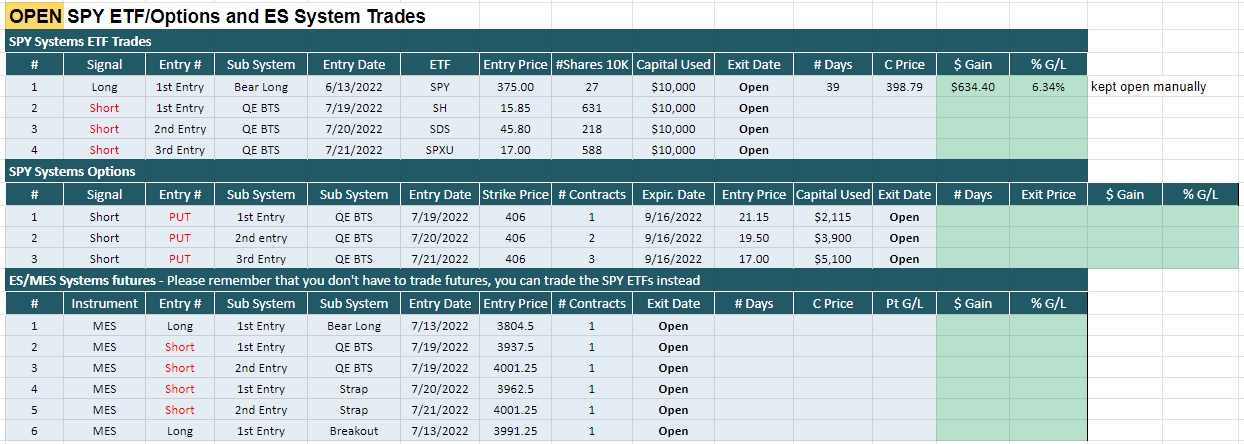 Hello everyone, here's a table that shows the current open SPY and ES system trades, quite a mix here.