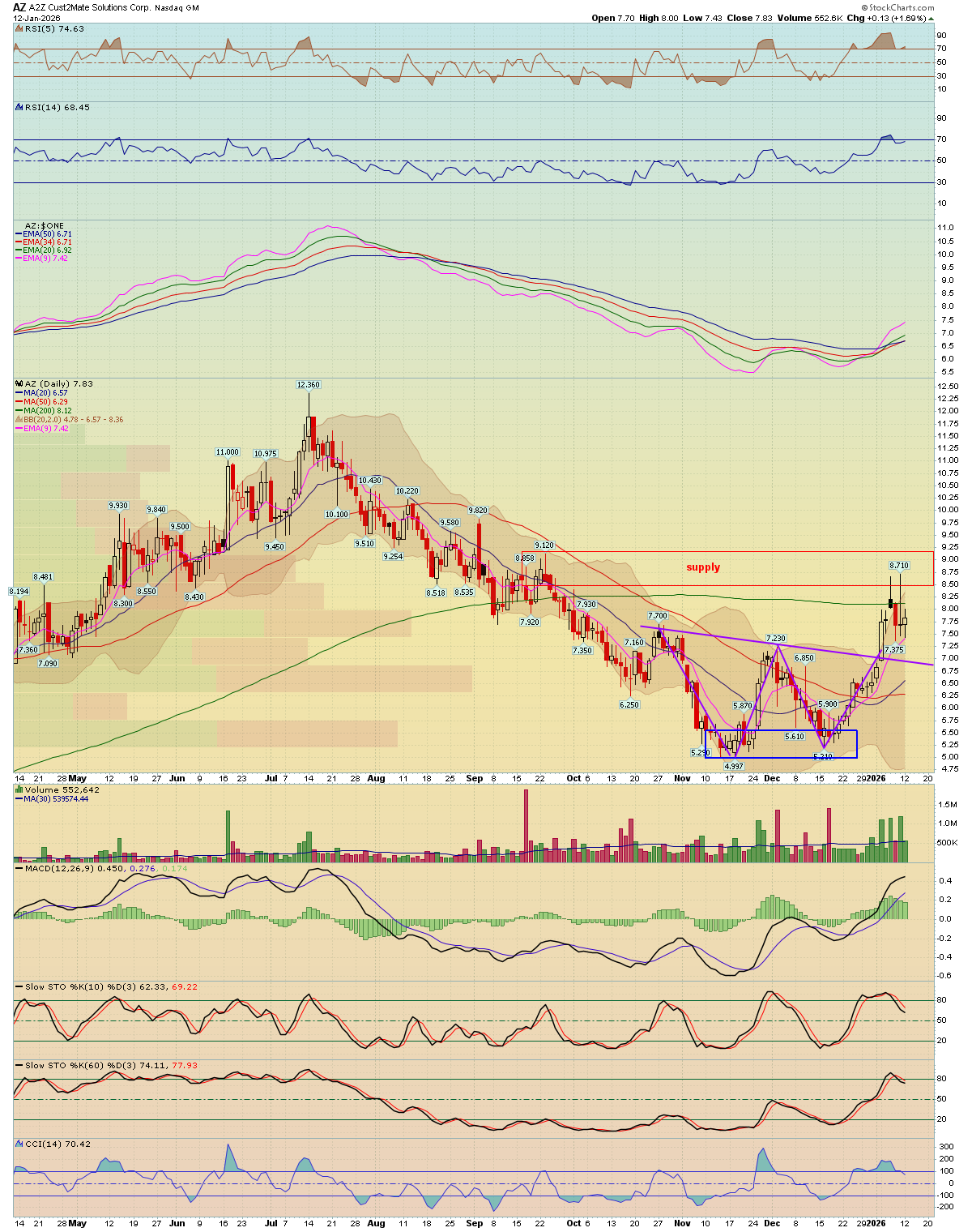 as you know AZ tagged supply twice over the last 2 weeks and pulled back from that, that said the volume is lighter on the pullbacks and the chart looks fine, I favor a higher low.