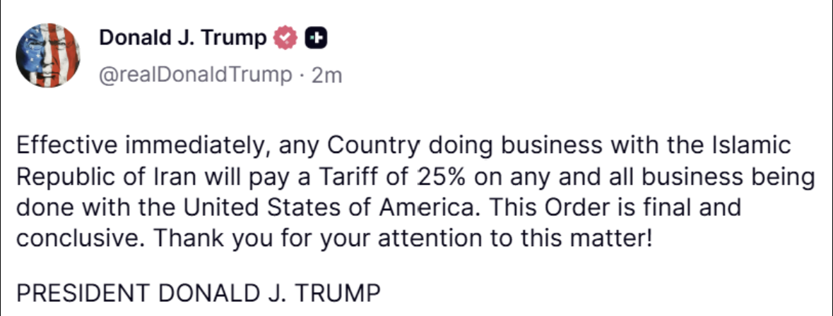 Effective immediately, any Country doing business with the Islamic Republic of Iran will pay a Tariff of 25% on any and all business being done with the United States of America. This Order is final and conclusive. Thank you for your attention to this matter!