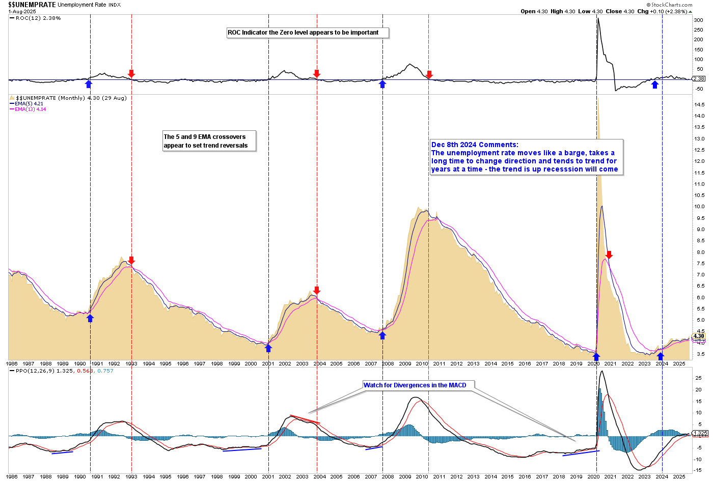 given all the layoffs and more importantly this chart of the Unemployment rate - it should only trend higher over time. The 5 month EMA crossed up over the 13 EMA just over a year ago -long term the unemployment rate should tick higher as this tends to move like a barge and trend for long periods of time, does not turn suddenly on a dime, which is those those two MA crosses work.