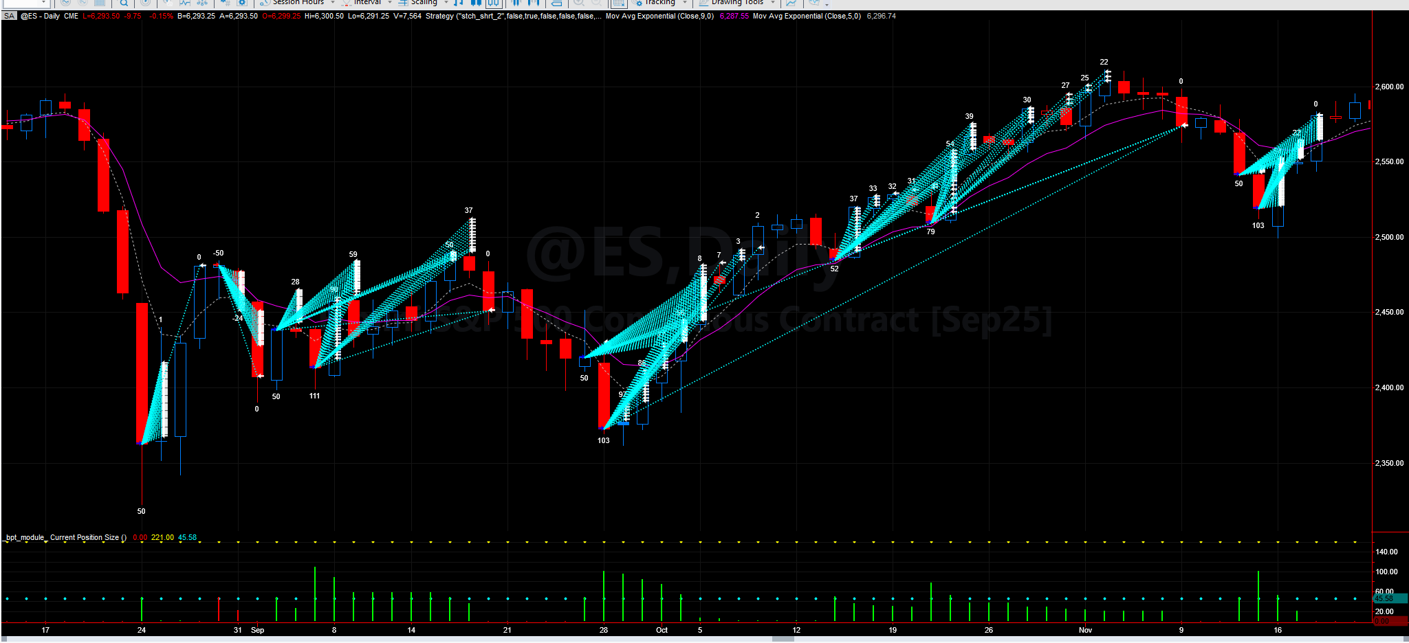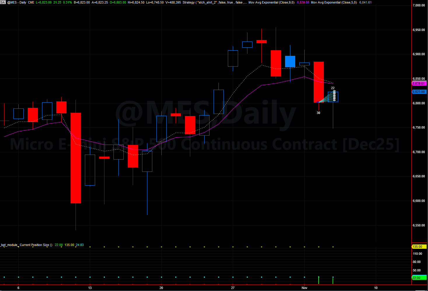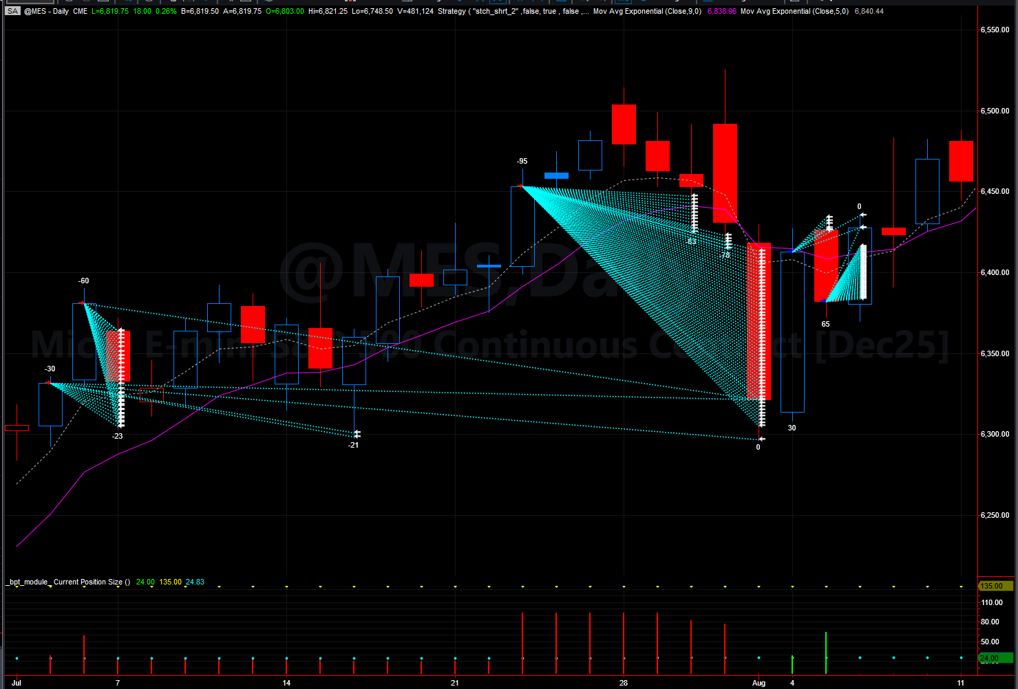 One version of this system went long yesterday, this is the aggressive scale out system with 99.5% winning trades because it uses intra day volatility to aggressively take profits, we'll see how much this scales out.