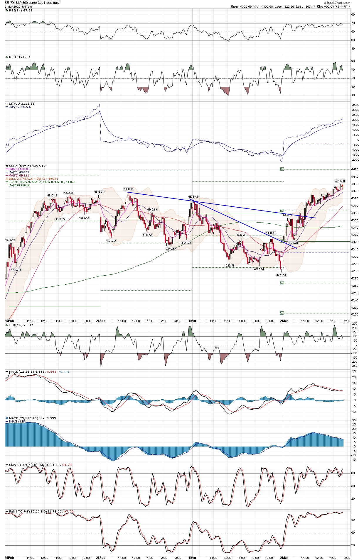 $SPX - Chart Link- this 5 min has the NYUD - it's useful for trend when it stays above or below that EMA