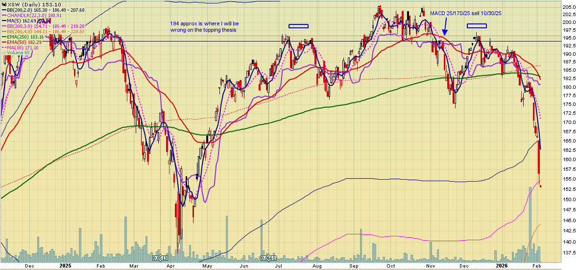 Software sector XSW continues to look weak- I haven't updated my chart since mid December and it is looking even more pronounced like a topping pattern. I would start changing my mind on a weekly close above around 192.
