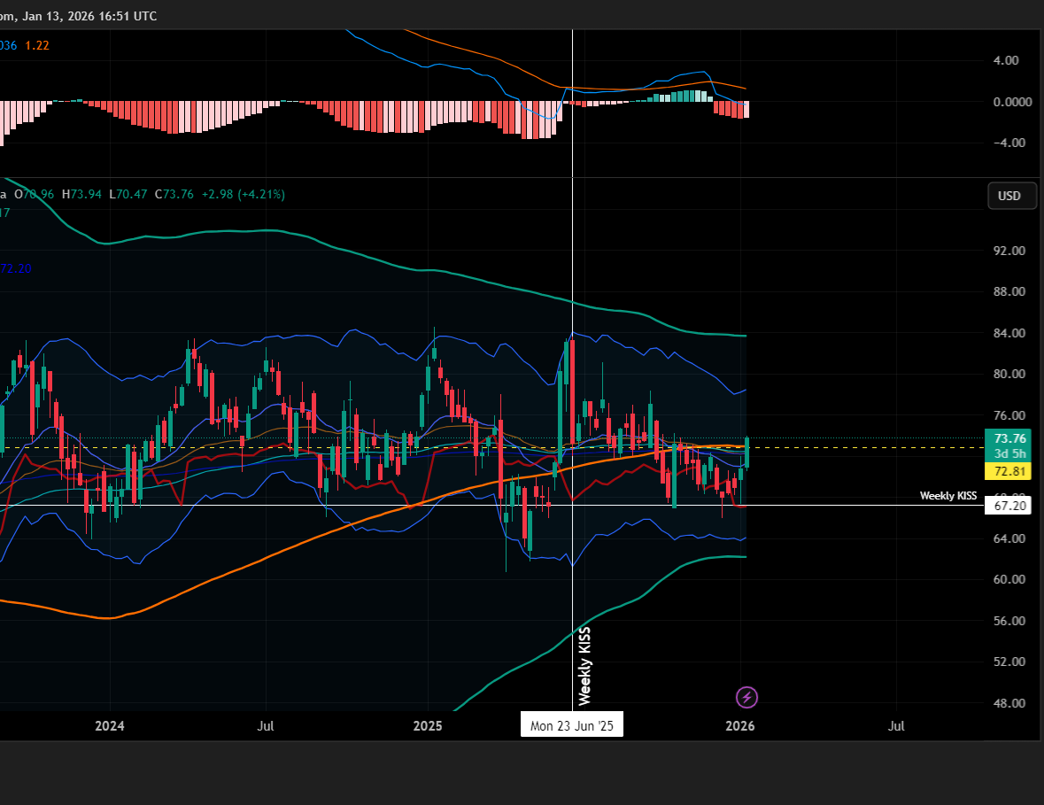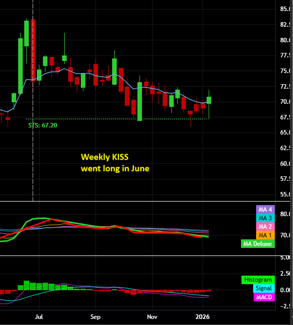 USO - Oil is breaking out this week but notice that it never made a Weekly close below the Weekly KISS STS established in June 2025. This is an example of how the Weekly KISS can keep you on the right side of the weekly trend.