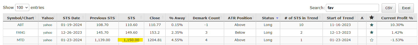 I have a question on the KISS system for one of the stocks I bought (MTD) from the initial alert as of 1/23. The STS on it was at $1,150. I just saw an email alert come through today with a new STS for MTD at $1,113. Is it possible that the STS dropped from $1,150 down to $1,113? I thought they stops only got ratcheted up over time during a trend up. Thanks in advance for your thoughts.
