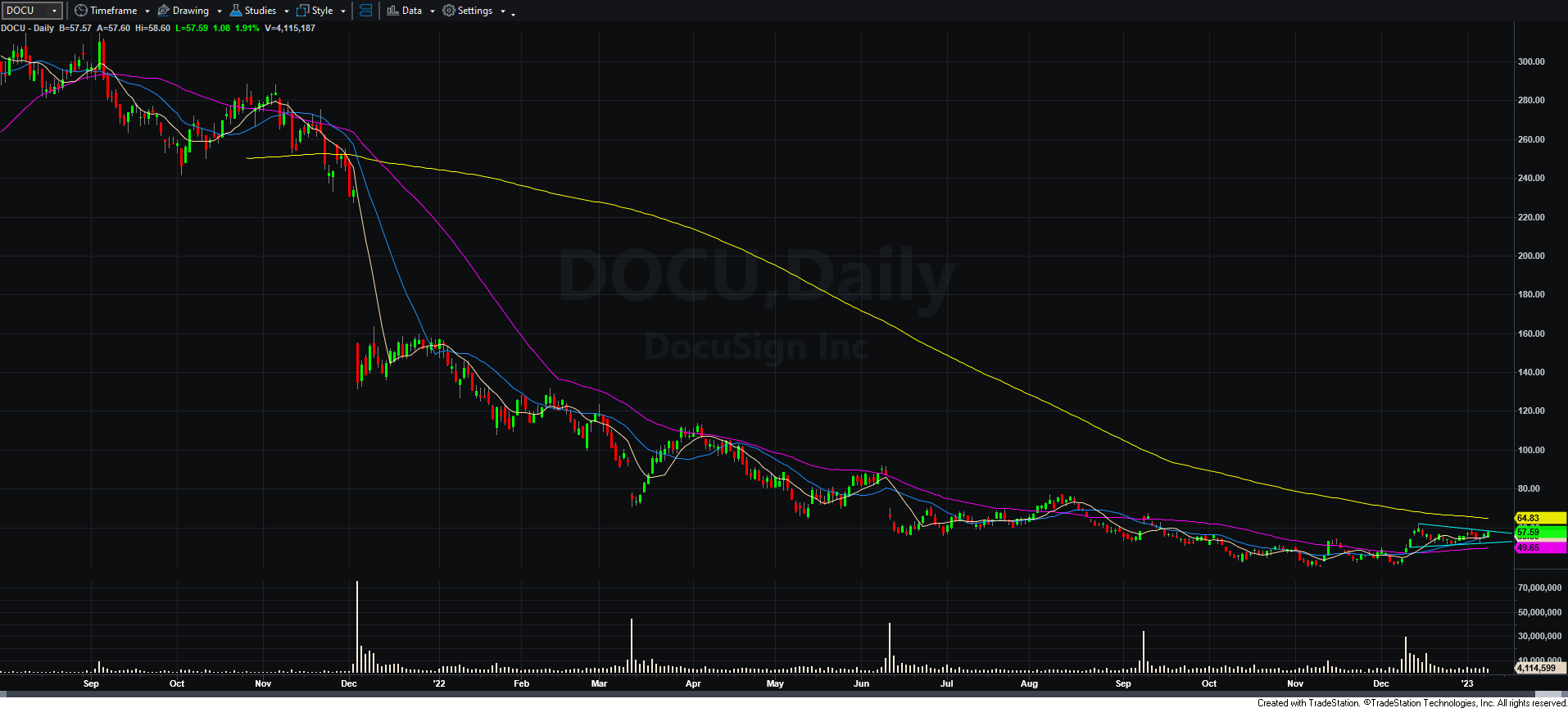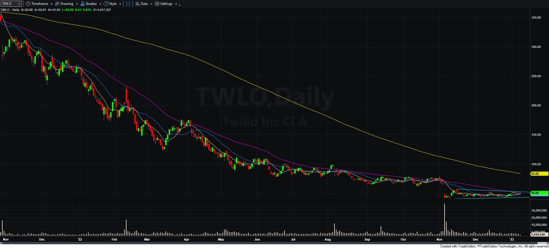 TWLO and DOCU look pretty good. DOCU looks like a recent symmetry break on the daily. TWLO ma's pinching underneath, triangle. Beat down tech names.
