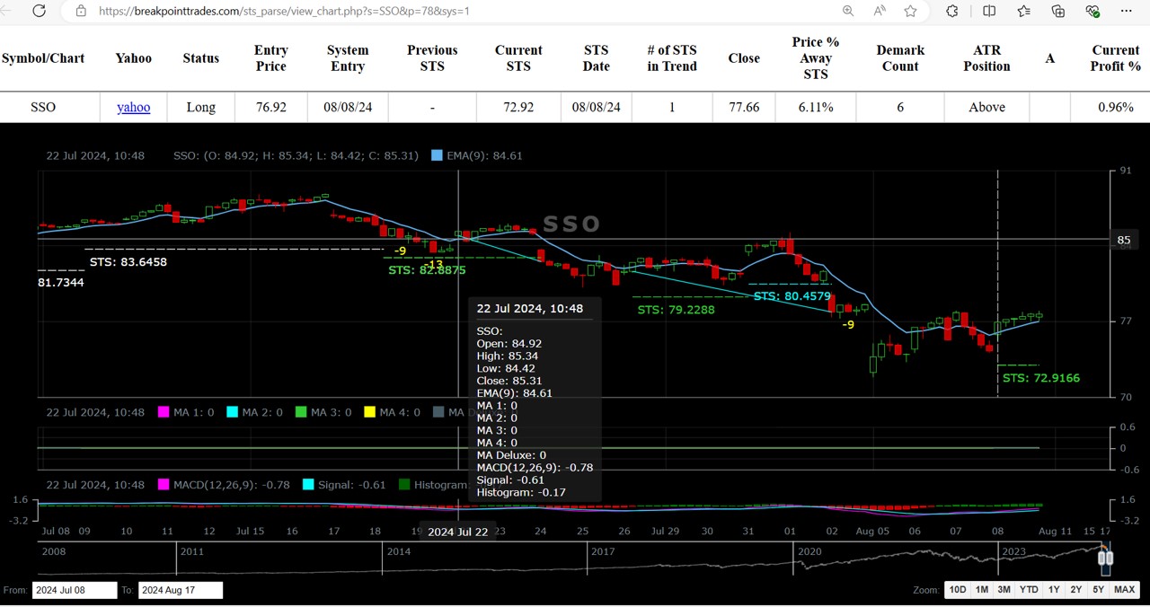 If we see anything we think needs addressing, do you want us to report it here or by mail? For example, here is a chart of SSO 78m, showing what appears to be a losing trade that triggers on 22 July. However, it's really a 'phantom' trade as the previous trade from 05/31 is still running at this point, as per the STS levels that you can see. If you go to the Trades tab, this phantom trade is missing as expected.