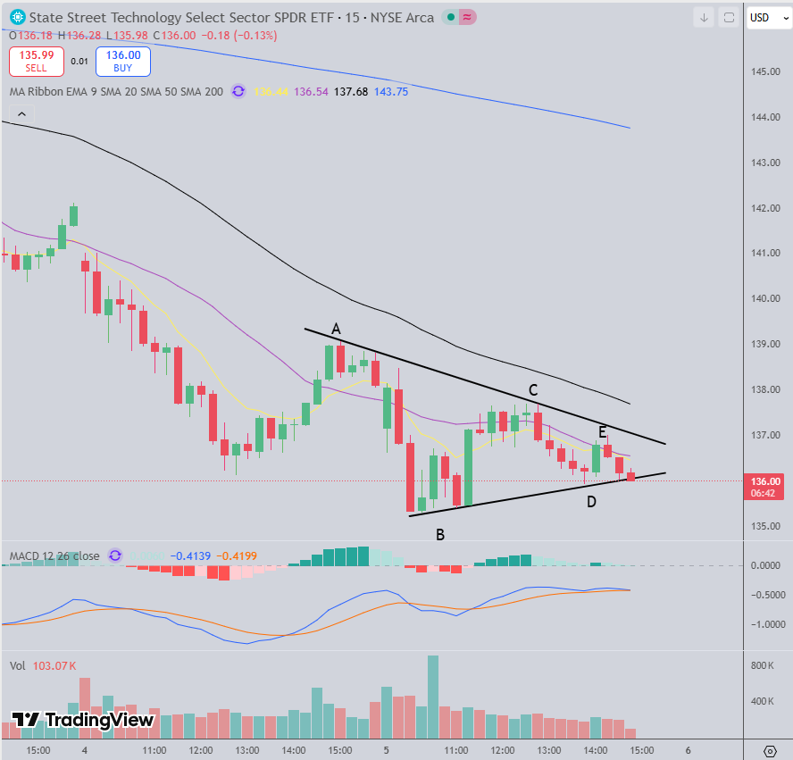 XLK, triangle on 15 min chart. Given that the gap and the 200dma are below, I wonder if it will break to the downside.