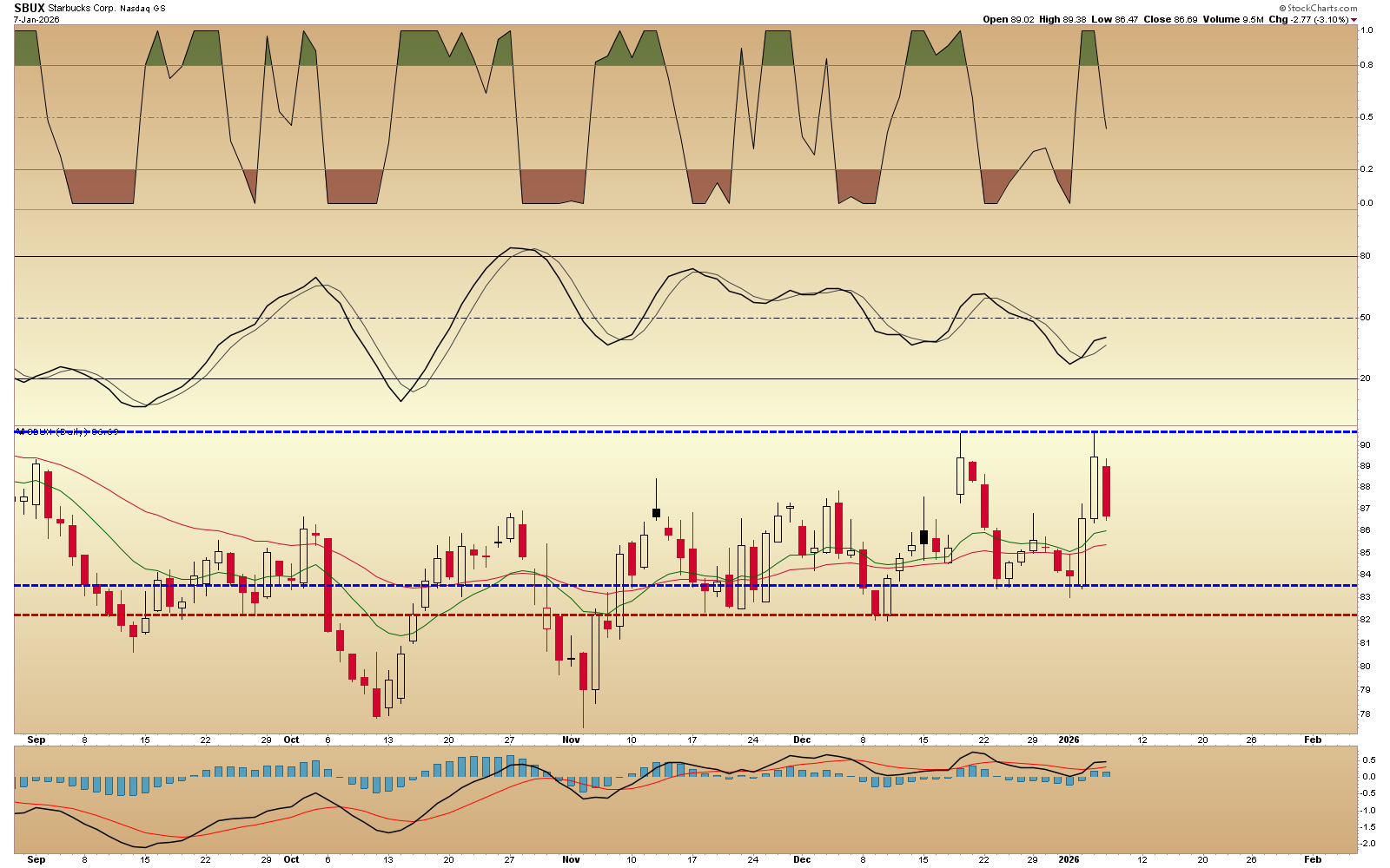 SBUX rejected at previous high - target at 83.50, maybe lower. (red line) This thing just plays ping pong regularly