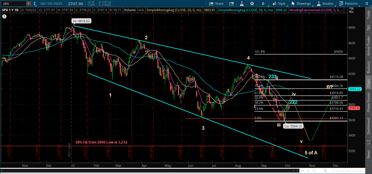 Tracking the daily SPX chart posted in weekend newsletters. So far, now symmetry break to the upside so maybe Wave iv is in. Maybe we recover and extend, or maybe we start Wave v.