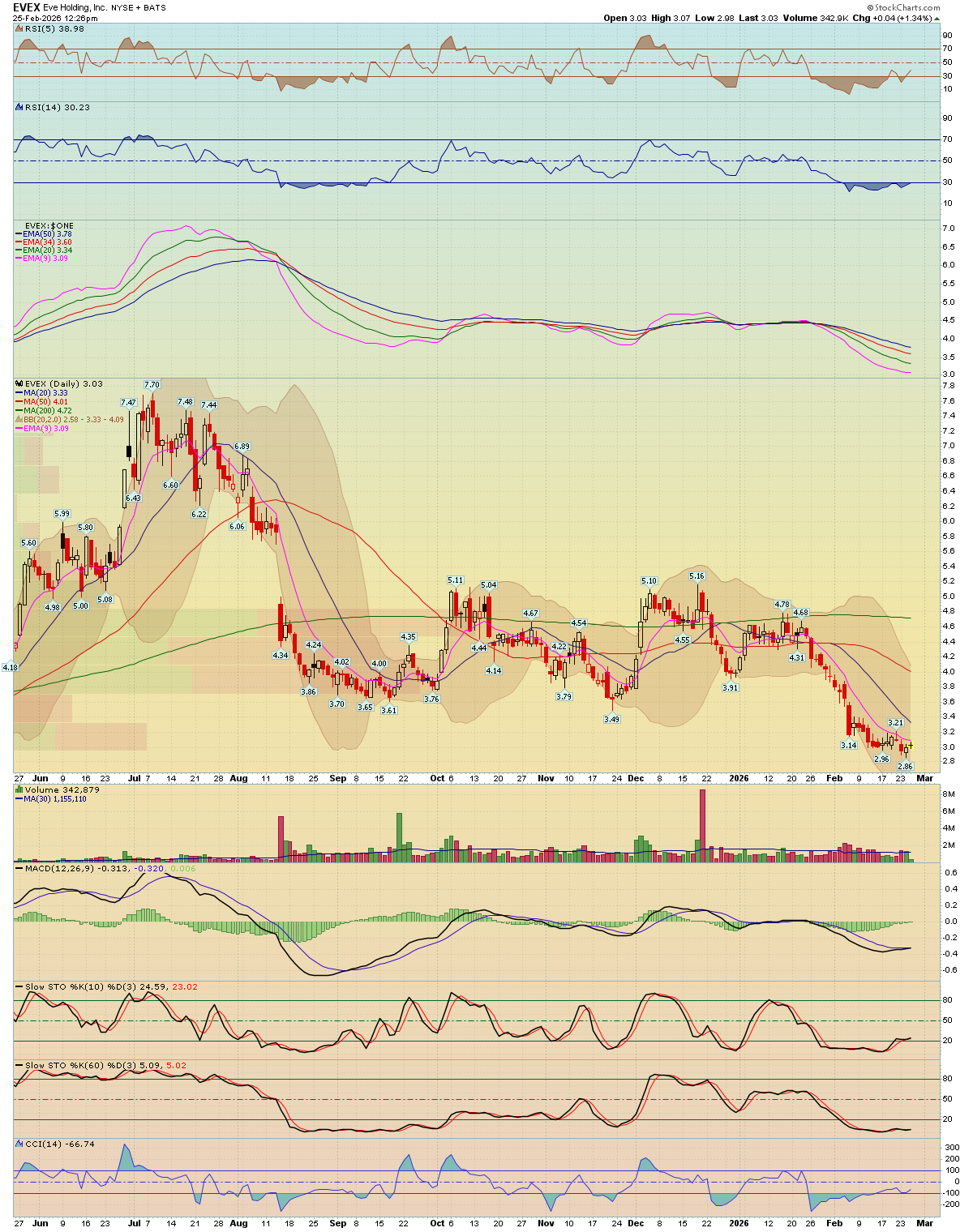 Air Mobility (EVEX) trades at a discounted enterprise value relative to peers (below Joby/Archer despite a large order book and UAM runway) while sitting on ~$410M+ in cash and equivalents with total liquidity near $534M, giving runway through certification milestones. With Embraer owning a majority stake (~72%+) and funding development through equity raises and Master Service Agreements, EVEX benefits from aerospace manufacturing expertise and improved capital efficiency versus standalone eVTOL developers. That combination of balance-sheet strength, discounted valuation vs peers, and strategic Embraer partnership underpins the case for adding EVEX ahead of type certification and early operations catalysts.