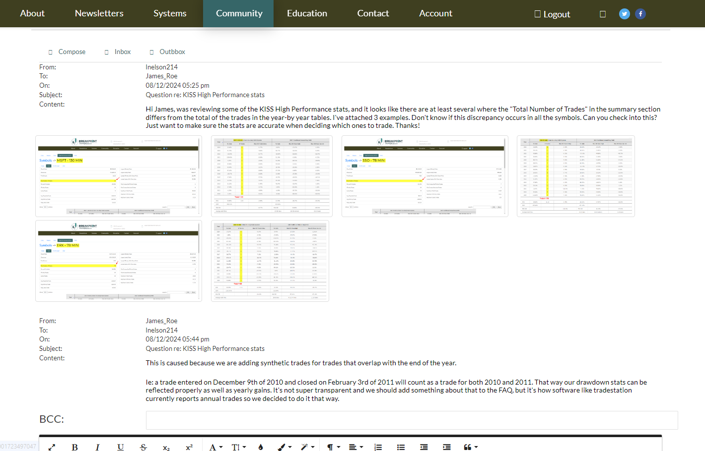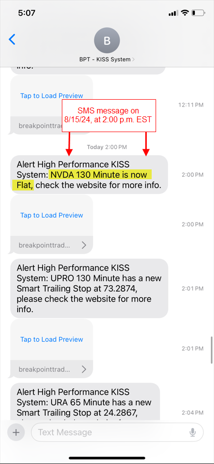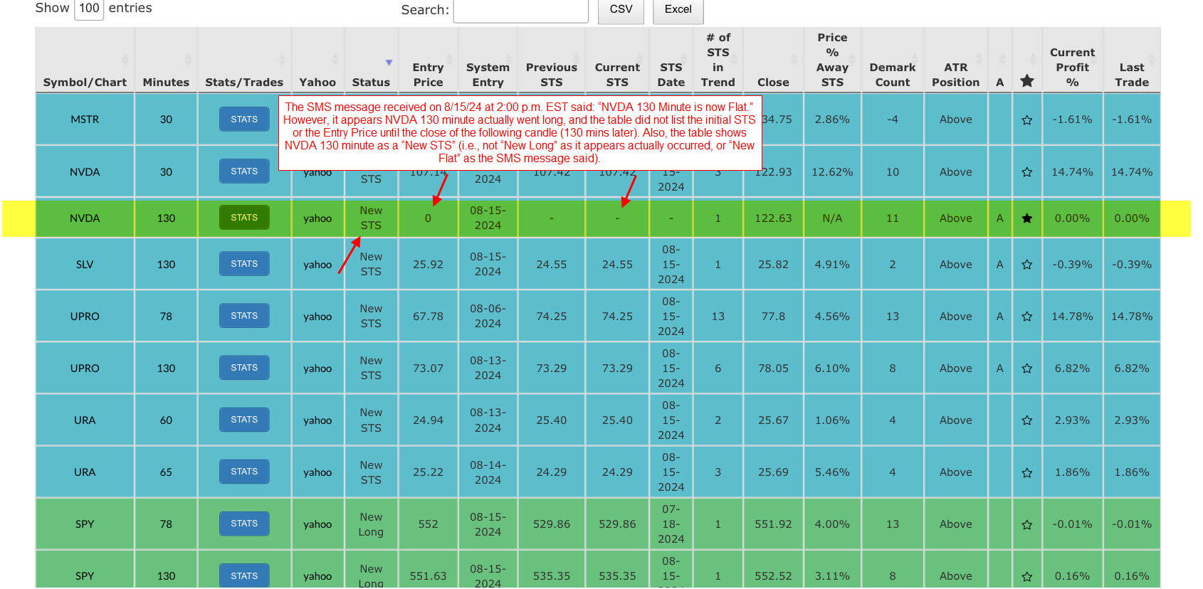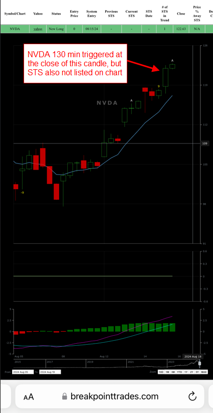 Another issue I noticed is that the SMS messages do not always correspond to what actually occurred. For instance, the SMS message received today (8/15/24) at 2:00 p.m. EST re: NVDA 130 min said: “NVDA 130 Minute is now Flat.” However, it appears NVDA 130 minute actually went long. Also, the table shows NVDA 130 minute as a “New STS” (i.e., not “New Long” as it appears actually occurred, or “New Flat” as the SMS message said). I sent James a couple of other examples by PM yesterday and on Tuesday. Thanks for your help!