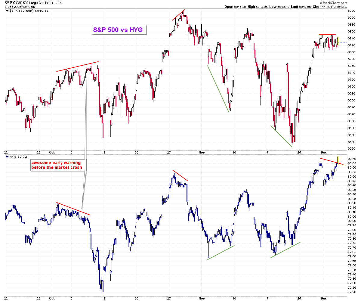 and on the 60 min chart since HYG did make a higher high unlike SPX, even if HYG reverses here that divergence is gone where HYG was lagging,