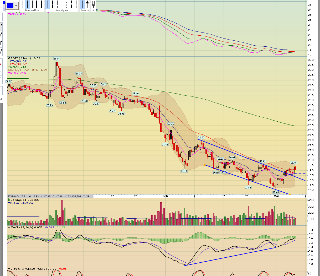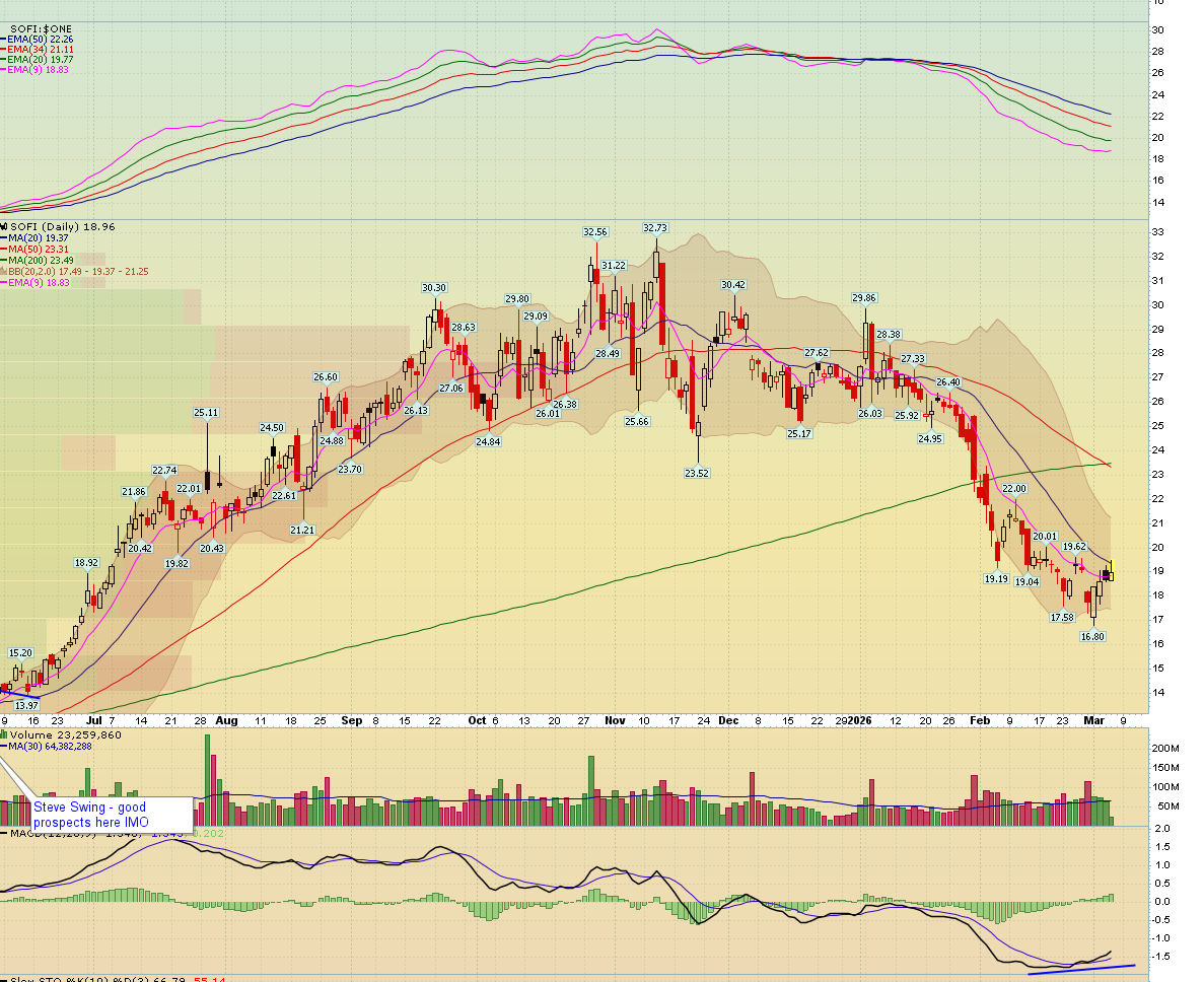 I don't have any strong opinions on SOFI, otherwise my comments are it bounced off divergent lows, stalled at 20 day MA, needs to get over that 20 MA, and 2hr you would want to see it hold that broken channel line now