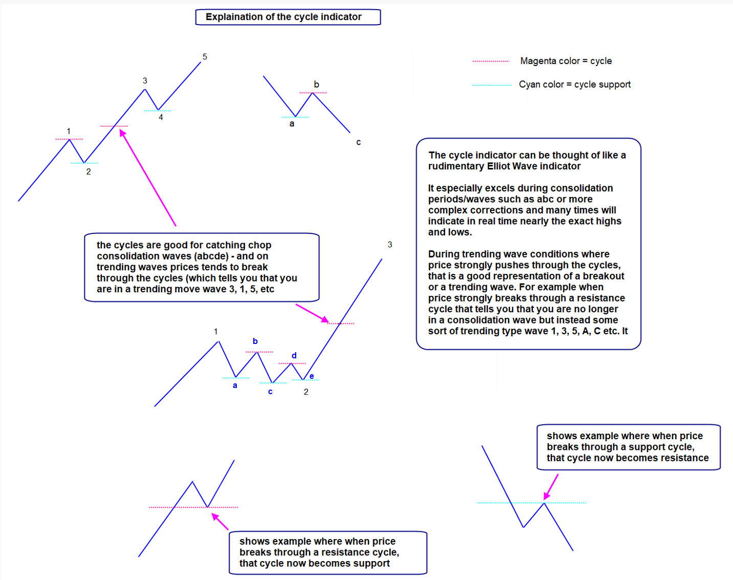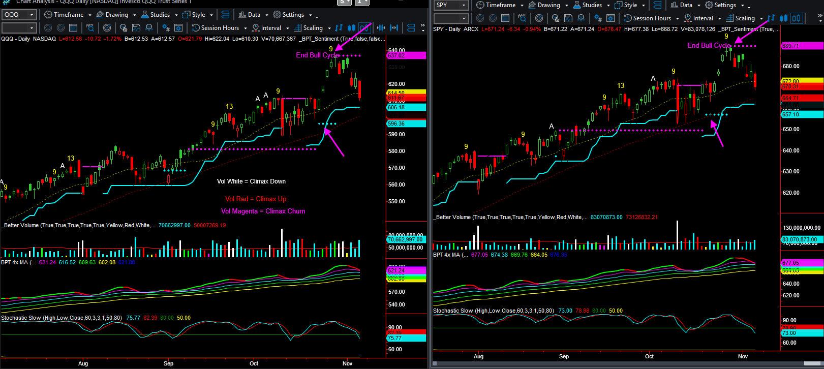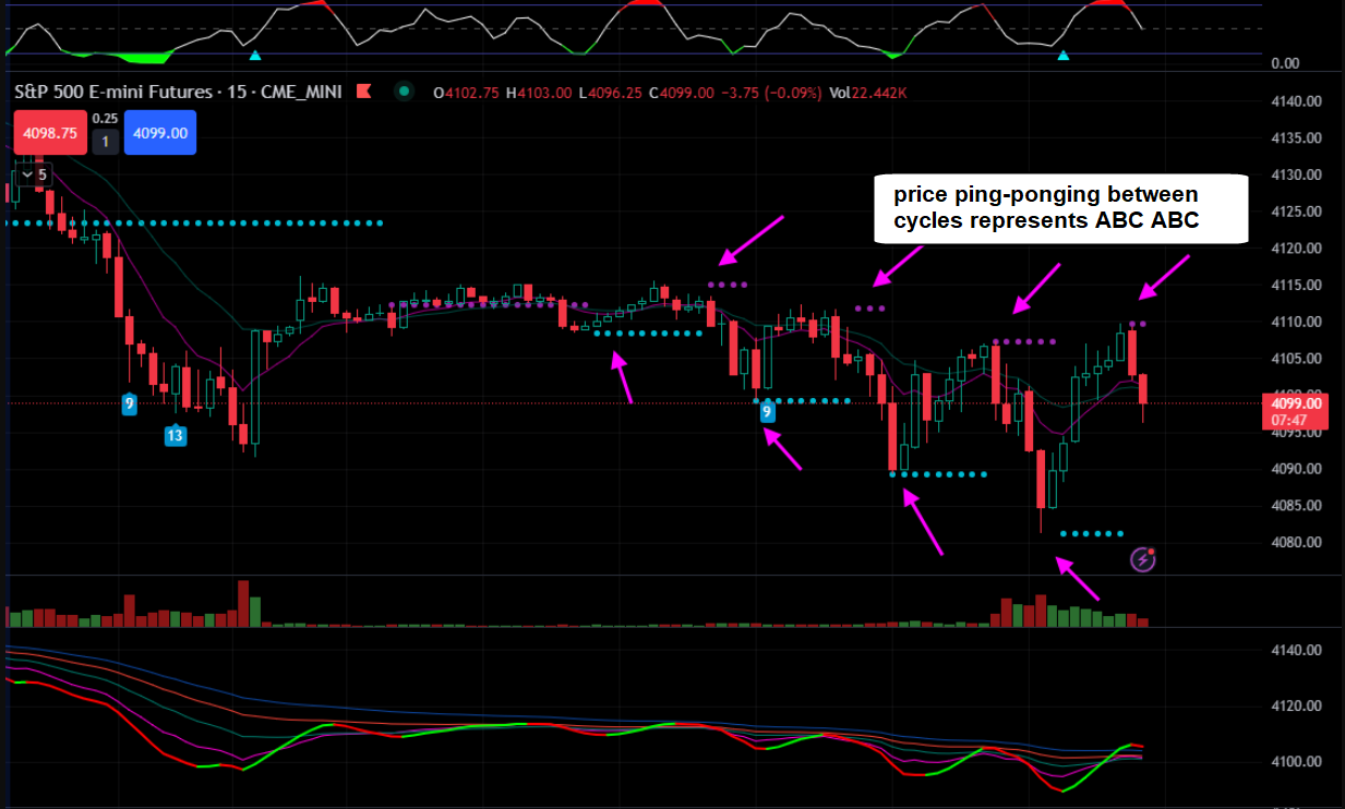 4hr charts of ES futures and SPY - focus on the custom cycle indicator