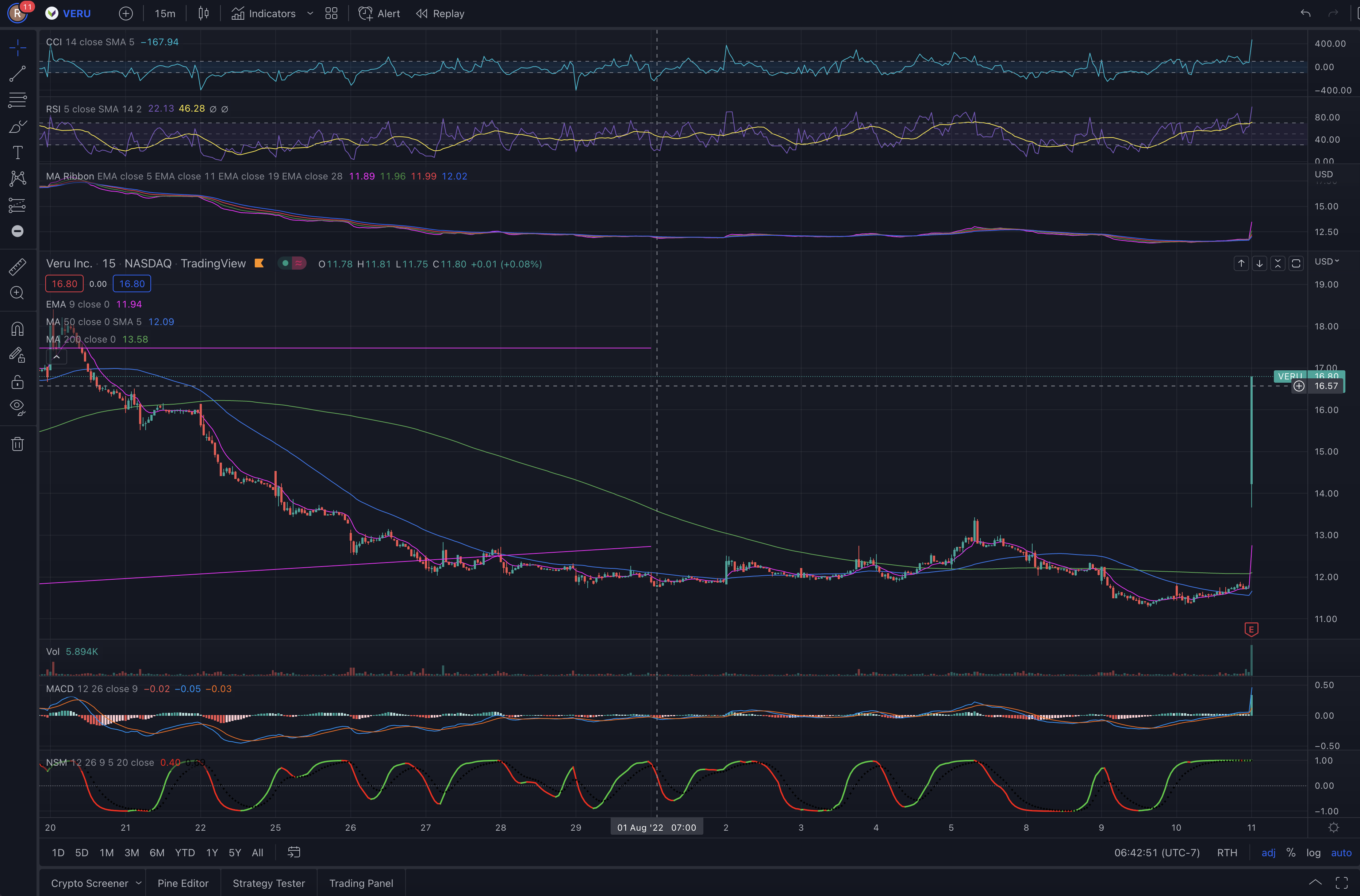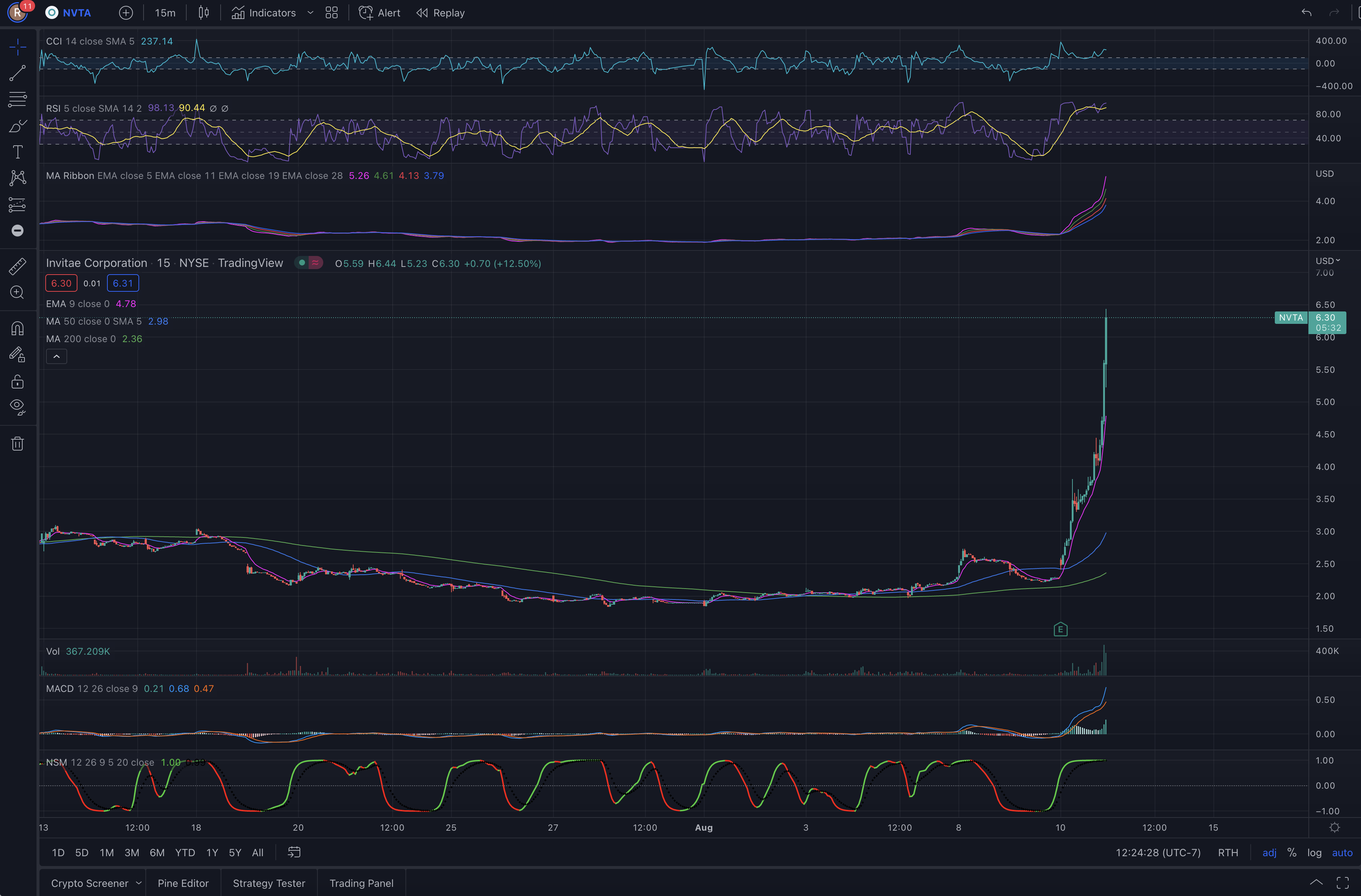 NVTA, up 175% today. Daily and 15min charts. Possible reversion to mean trade.