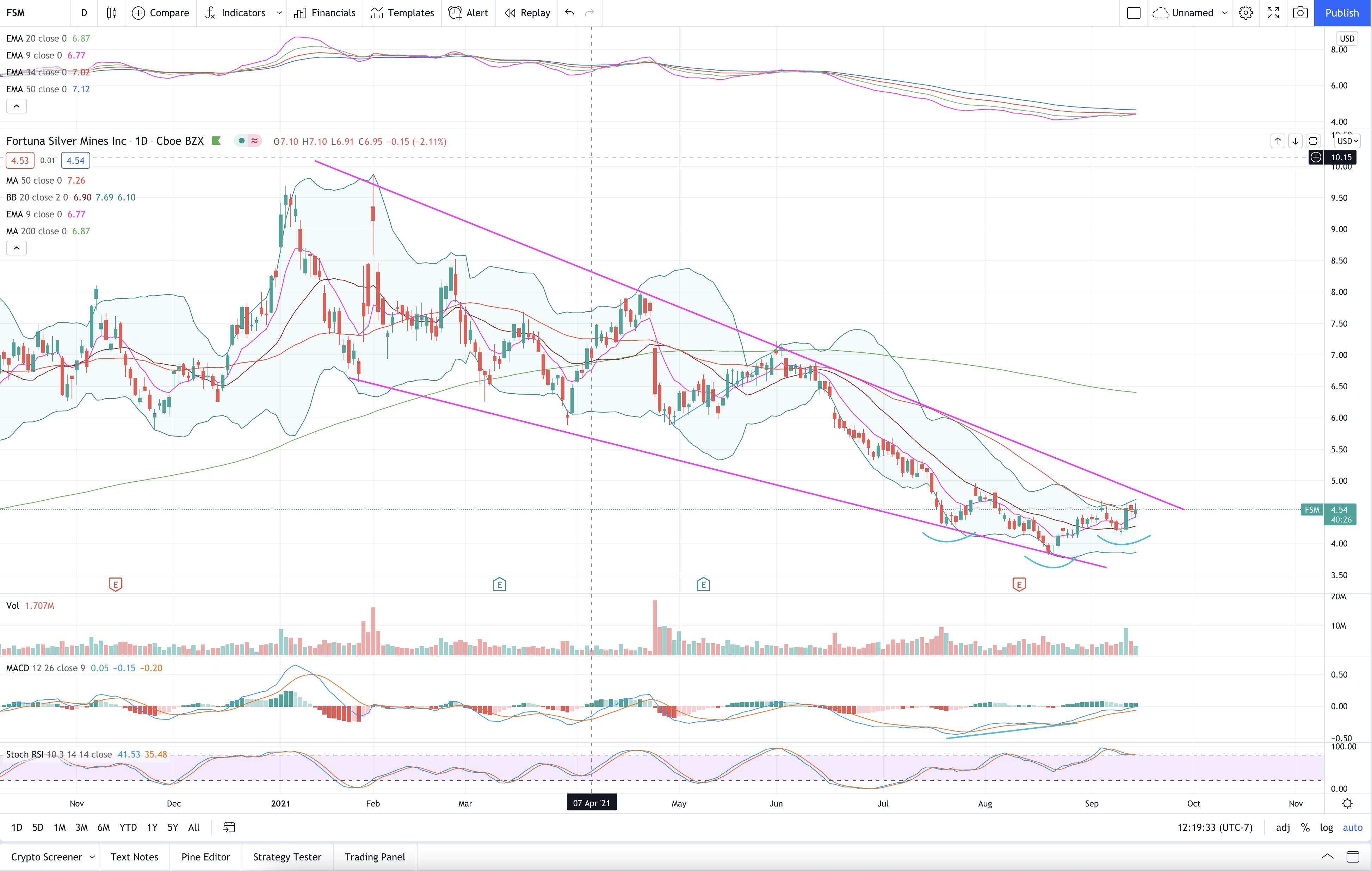 FSM looking interesting here. Held up well while Silver putted about this week and bounced up off 9EMA. Inverse H&S and falling wedge w/ MACD divergence. Taking a half position with stop below previous low.