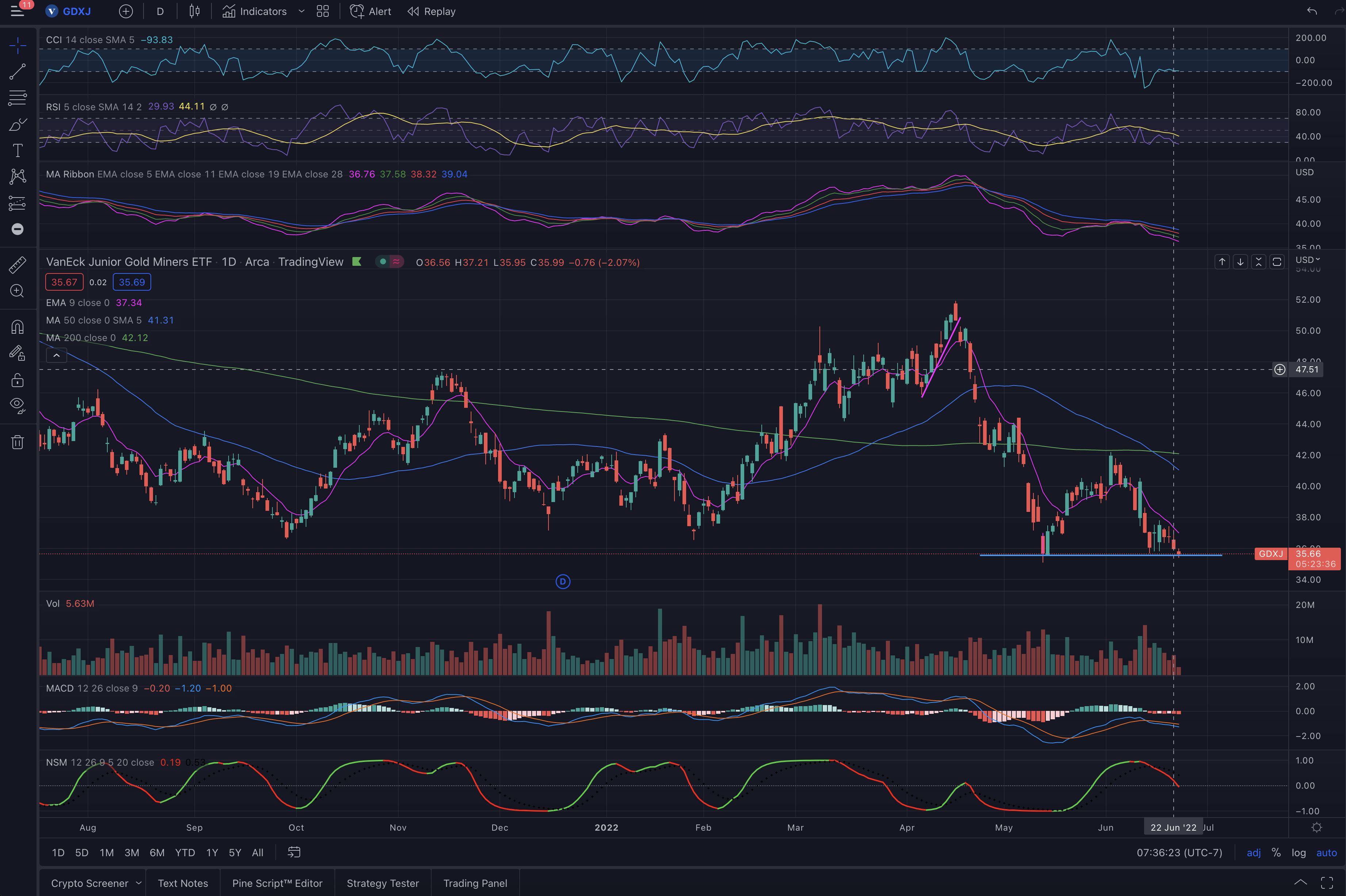 Taking a starter position in miners - SILJ, GDXJ and few individual stocks. Sitting at support; stops a little below mid-May lows.