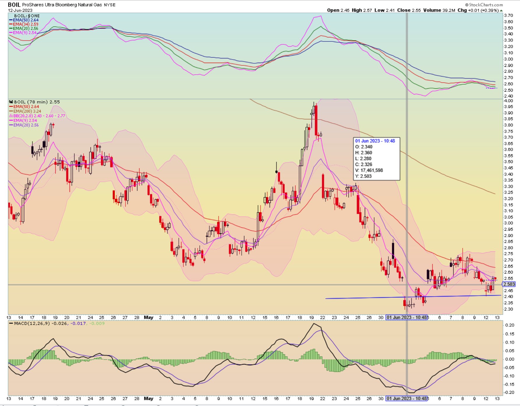 Boil didn't hit Matt's stop at $2.40, but it did trade at $2.41 at 10:25 this AM. Matt, did you set that stop at the top of a demand zone and/or the bottom of a 9 day ema? I