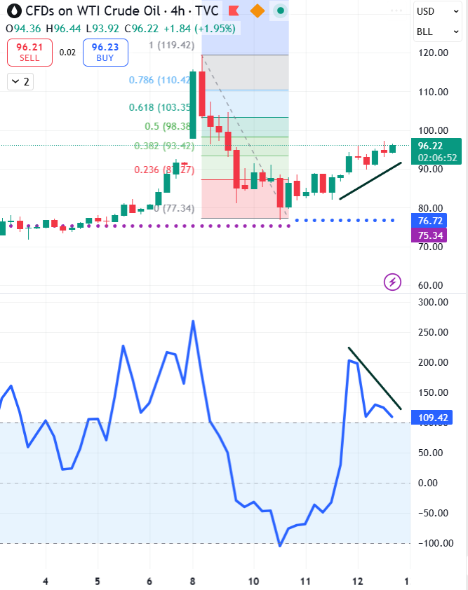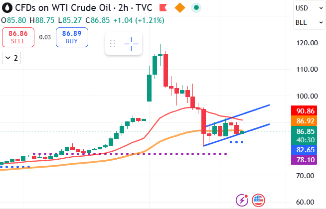 A bearish channel on the 2hr forming in Oil. However, materially