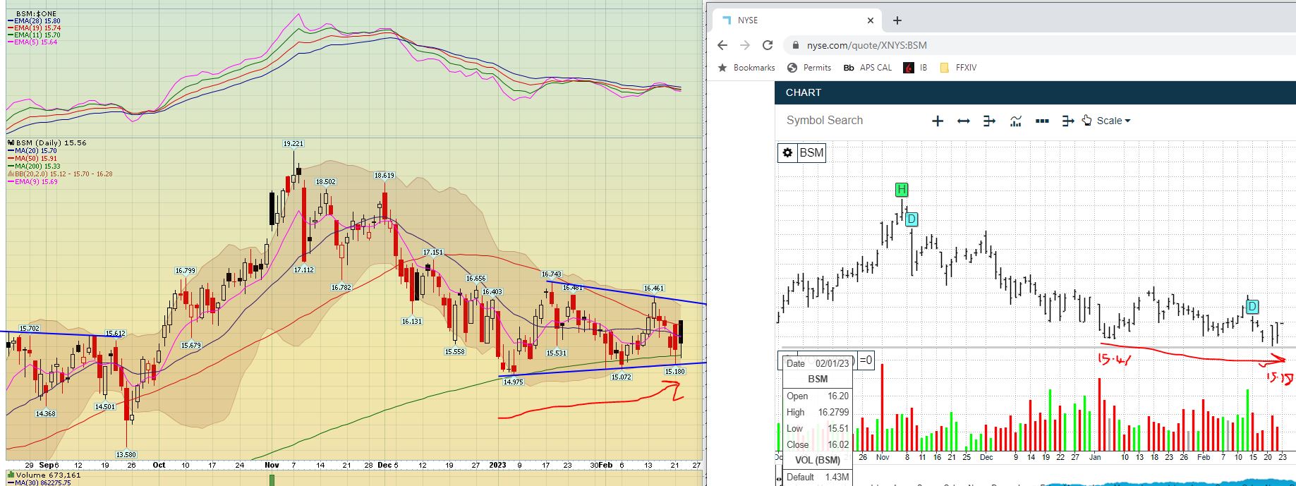 Incorrect Prices - Why does StockCharts often have incorrect prices? I noticed it in the newsletter on the BSM chart. The StockCharts prices indicate a rising support, but the official prices on the NYSE site show a falling support support.