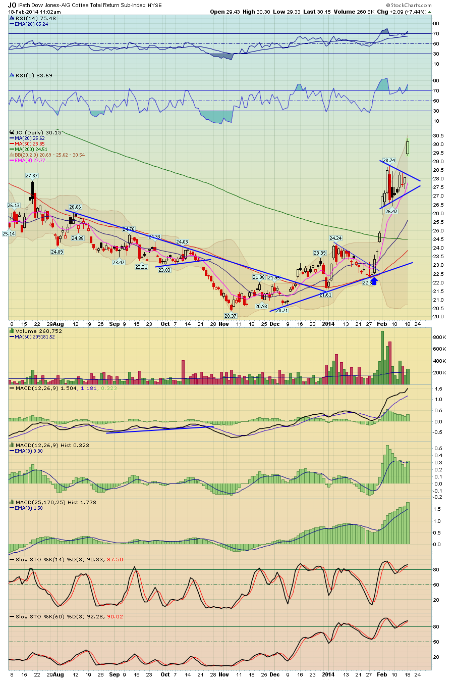yeah while coffee had a 65% correction off the 2011 prices through Nov 2013 Starbucks didn't lower prices of their lattes, and of course with coffee prices now going back up, but way way off the highs, they will probably use that as justification to raise prices some LOL that's how the game works. JO and coffee had formed a bull pennant and so gapped up out of the pattern