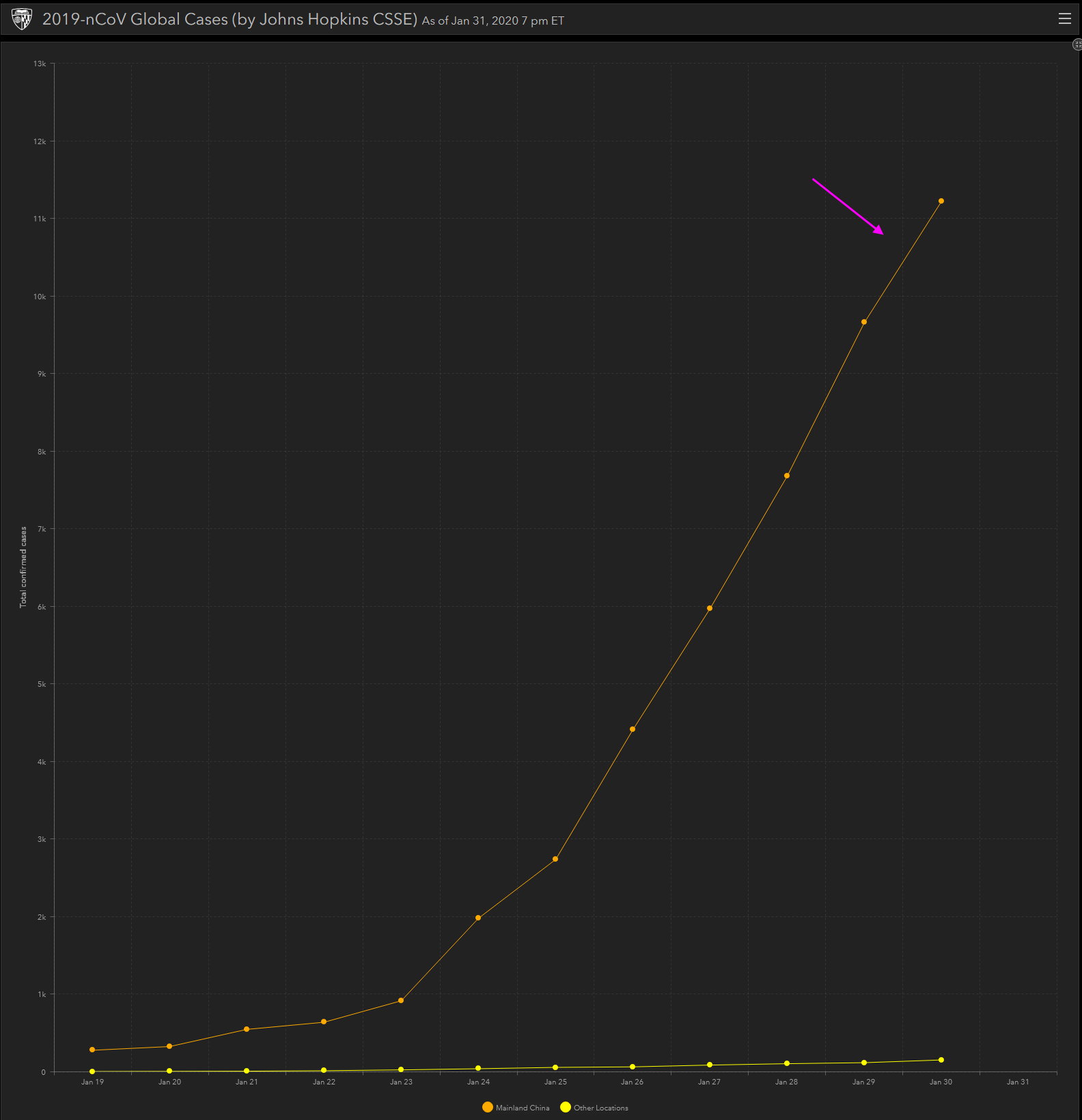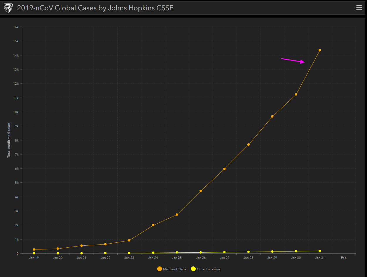 yes that's true, however still some of the early stats are alarming. First off I check this once a day, what I pay attention to is the slope of the graph, we are all visual traders here, so the parabolic nature of new cases still stick out to me. last night one data point slowed down however today that next data point jumped a lot, thus picking back up the parabolic slope.
