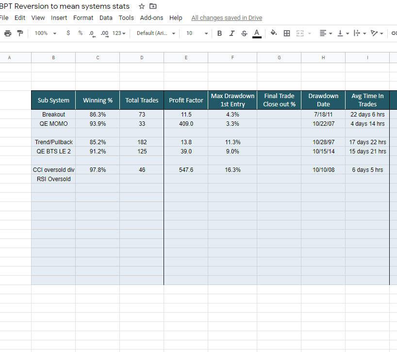 here's an image of all the long sub systems: currently we have the 3 entries on Trend/Pullback, two entries on CCI and QE BTS. However Bull exhaust is long as well (I don't send orders because again it's covered up), and today the RSI oversold is going long, bottom right, which again I don't send orders out. By the way the max historical draw down on the RSI oversold is 5%.