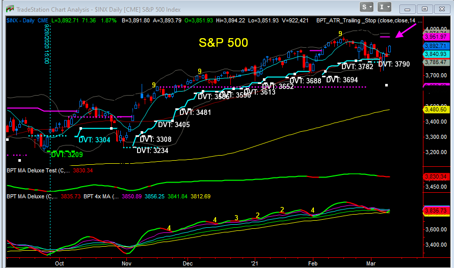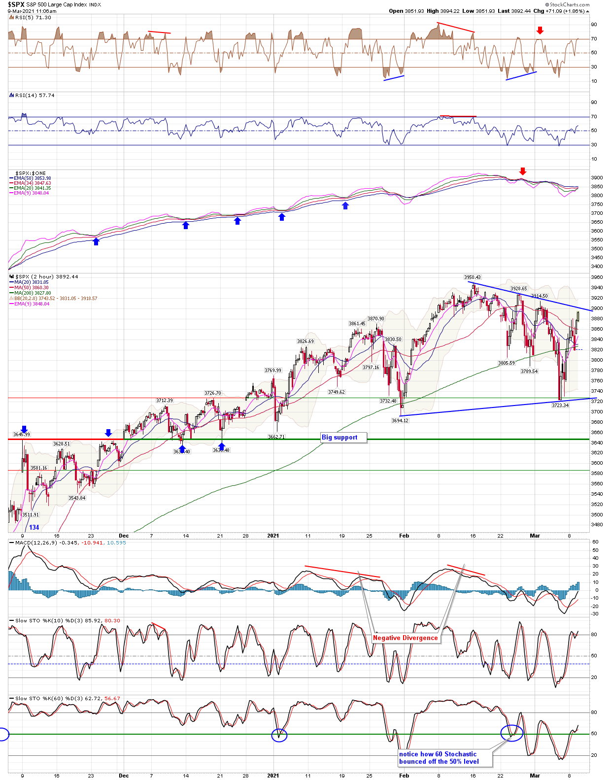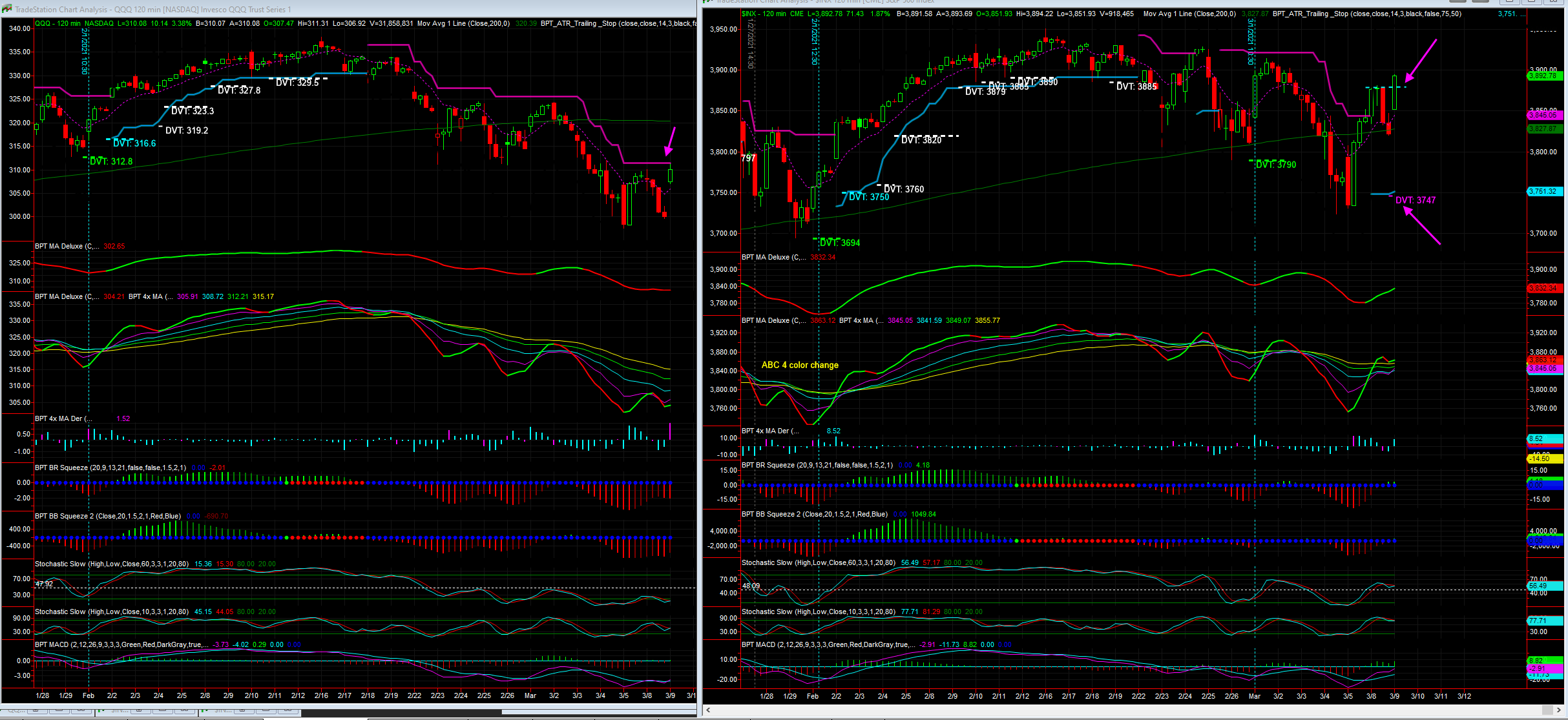 here's a few charts, daily KISS, the ATR is quite far away. A chart showing 2hr of QQQ and SPX, so far the ATR stopped the QQQ's again. On the 2hr SPX price did confirm there so you see that new DVT. The third chart a traditional 2hr, one could also monitor that downtrend line