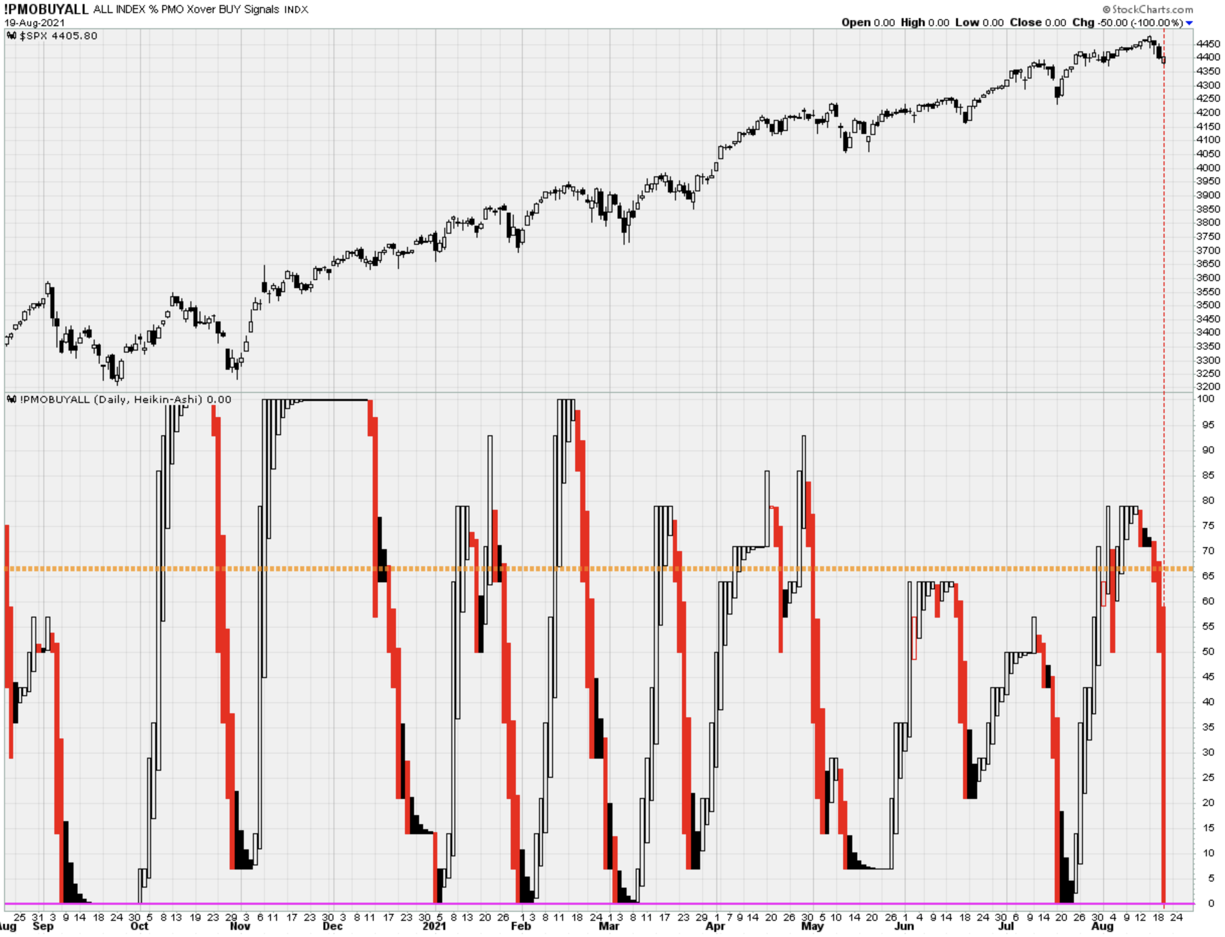 September10, 2018: The !PMOBUYALL candle was a hair over 50 points long. The previous candle (on Friday) was red and 70 points long, starting at around 83 and ending around 18. $SPX did not print an unusual candle on either of these days. Friday's was a white inverted hammer bottom ending a six-day decline of some 50 points. Monday's $SPX candle was a doji inside day. The market then advanced for two weeks, pulled back a bit, then made a double top in the first week of October. This began a ~20% correction into late December.
