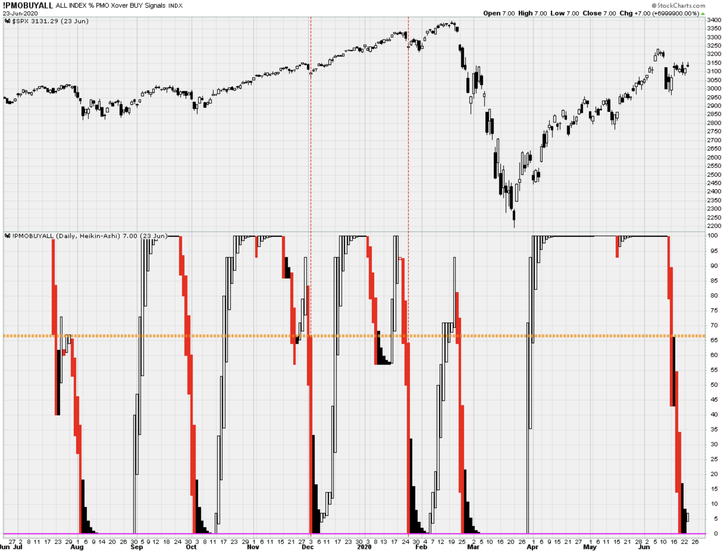 January 24, 2020: This was pretty much a fractal of what happened on December 3. !The PMOBUYALL candle was 64 points long. The previous candle (on Friday) was red and 28 points long, beginning at 78 and ending at 50. The $SPX candle on Friday was red and some 50 points long. On Monday, $SPX gapped down and formed a red doji. The next two days were up, then $SPX pulled back and made a new low before advancing two and a half weeks before plunging off the COVID cliff.