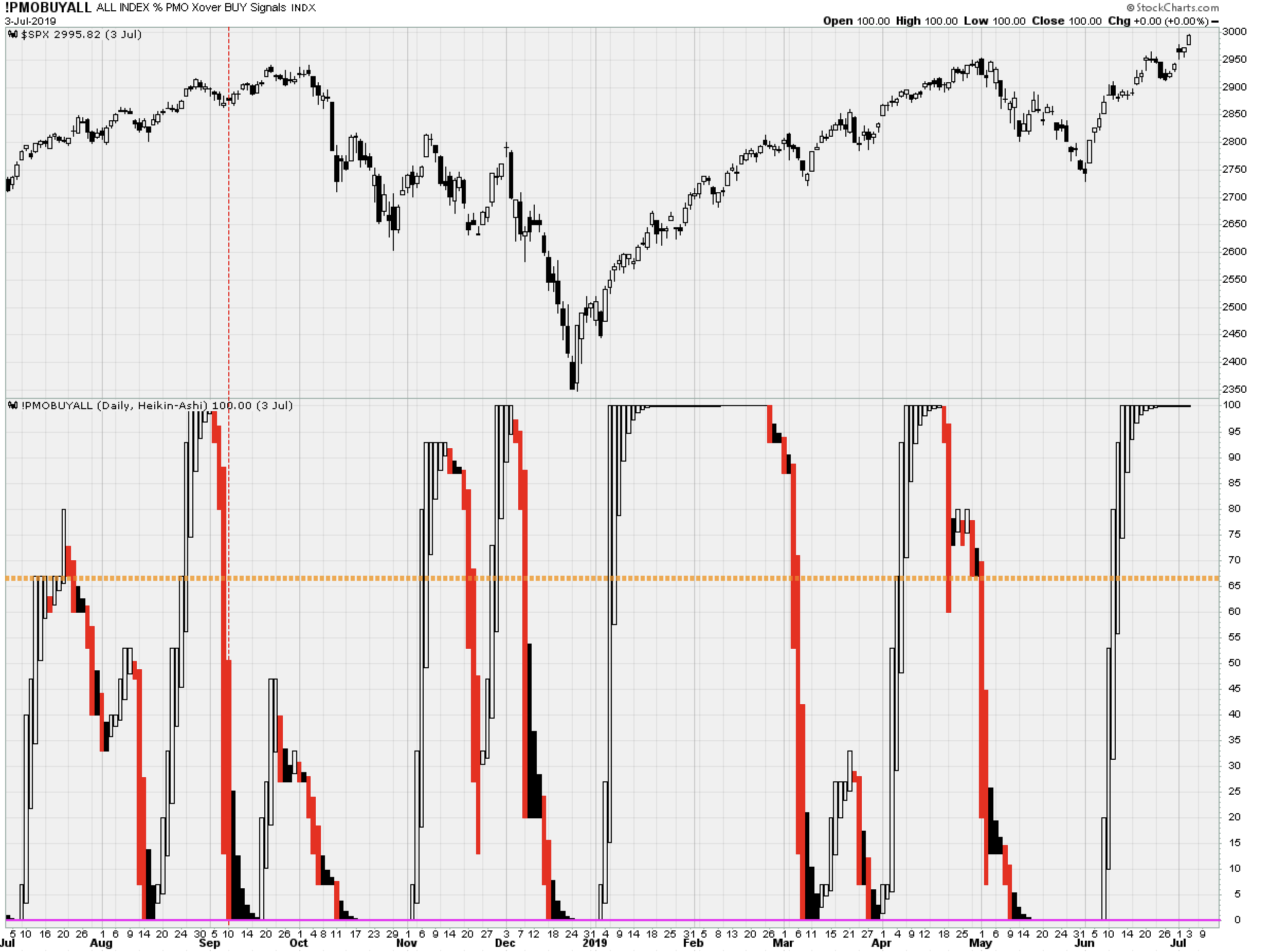 December 3, 2019: The !PMOBUYALL candle was 66 points long. The previous candle (on Friday) was red and 34 points long, beginning at 84 and ending at 50. The $SPX candle on Friday was red and looks to have been about 40 points or so long. The market had been moving up pretty steadily the prior four months, and that Friday candle began a 3.5 to 4% pullback. On Monday, $SPX gapped down and formed a hollow red hammer. The market then advanced some 200+ points over the next two months, where it reached our third occurrence...