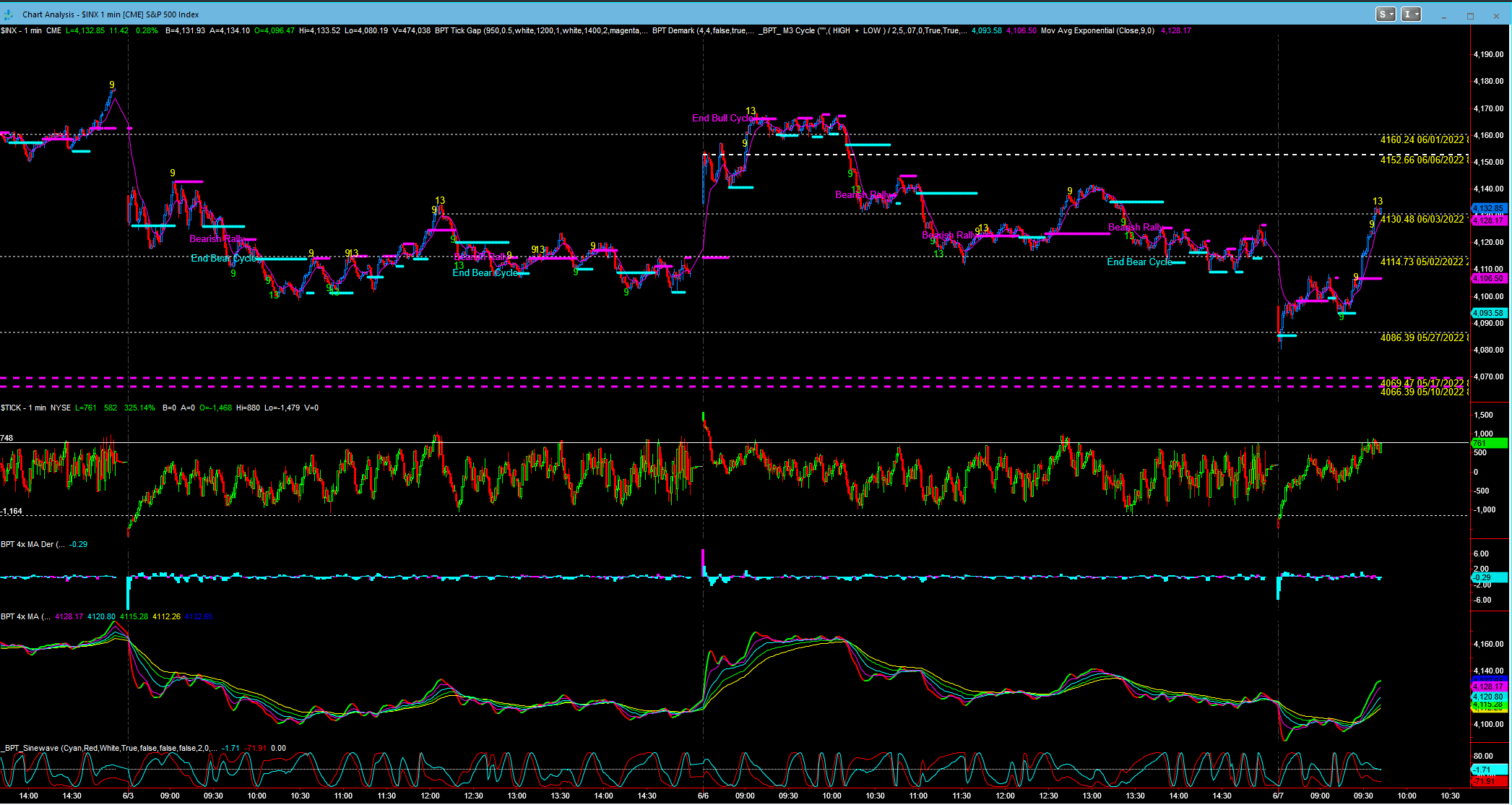 Notice SPX has rallied to the 4130 tick pivot - there's free air, kind of a thin zone, to the next pivot at 4153