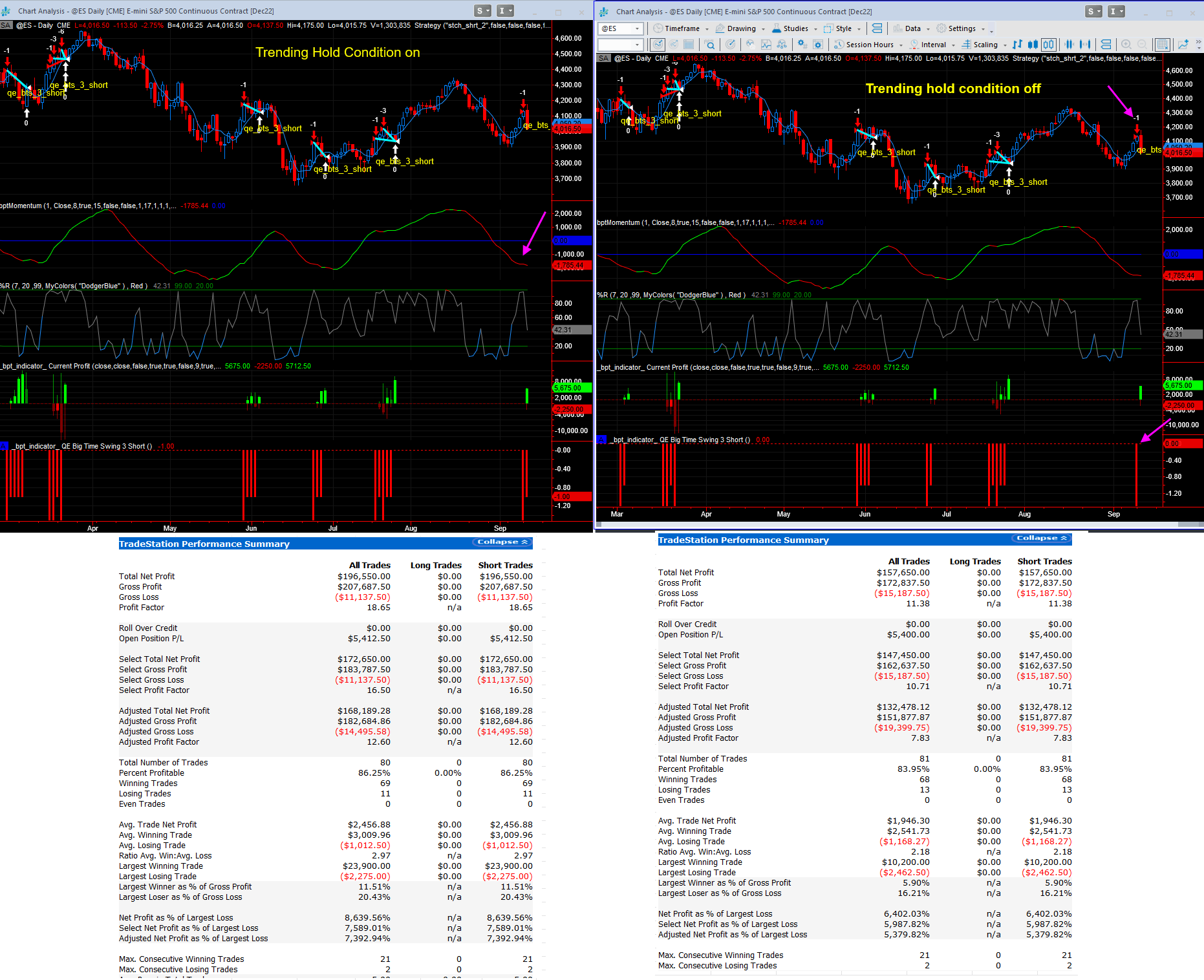 here's the QE 3 - again the version where the momo is turned off on the right you can see that it closed out. The one we are using, on the left continues to hold. One could split the difference and exit 1/2 if they chose