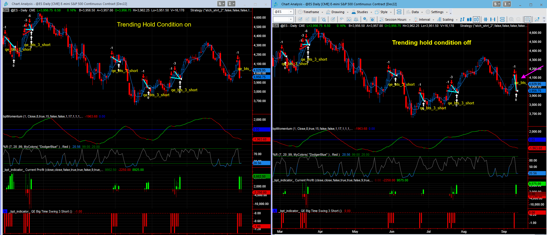 here's the QE 3 - again the version where the momo is turned off on the right you can see that it closed out. The one we are using, on the left continues to hold. One could split the difference and exit 1/2 if they chose