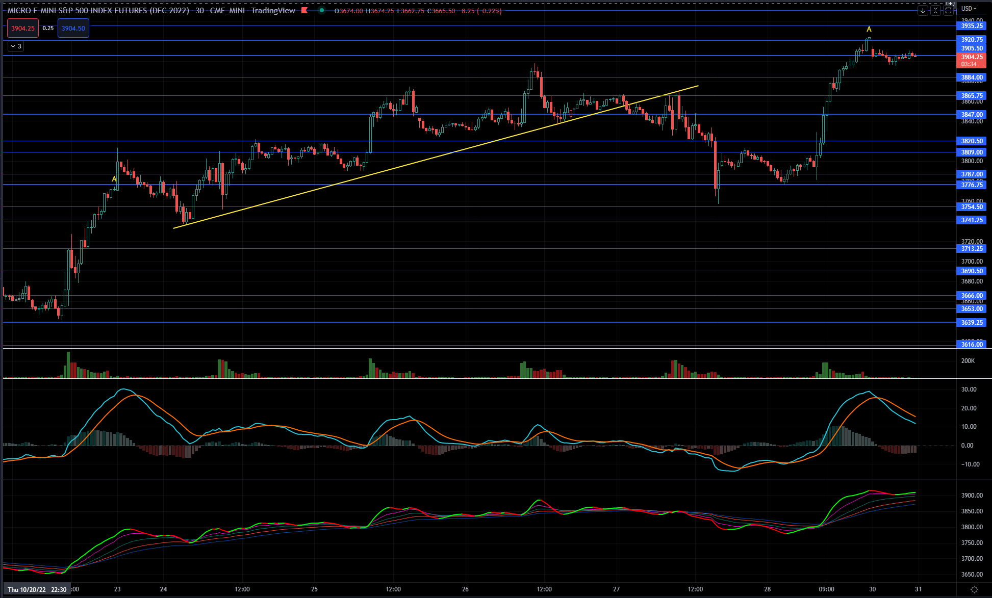 here's the trusty ES chart with the ES levels I post. Note the last 30 min on Friday ended with our Trusty A