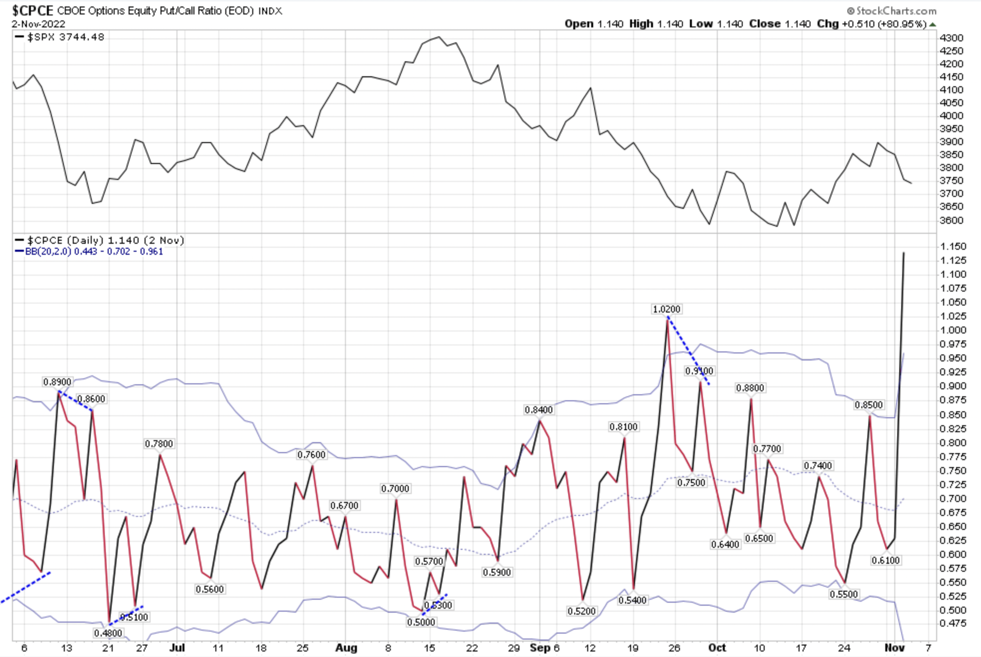 $CPCE was REALLY high yesterday and way above its upper band. This makes the lack of reaction in the $VIX even more curious. With so much put buying, I would expect it would be reflected in the $VIX. But what do I know? Probably a simple explanation for it, but I'm not privy to it.