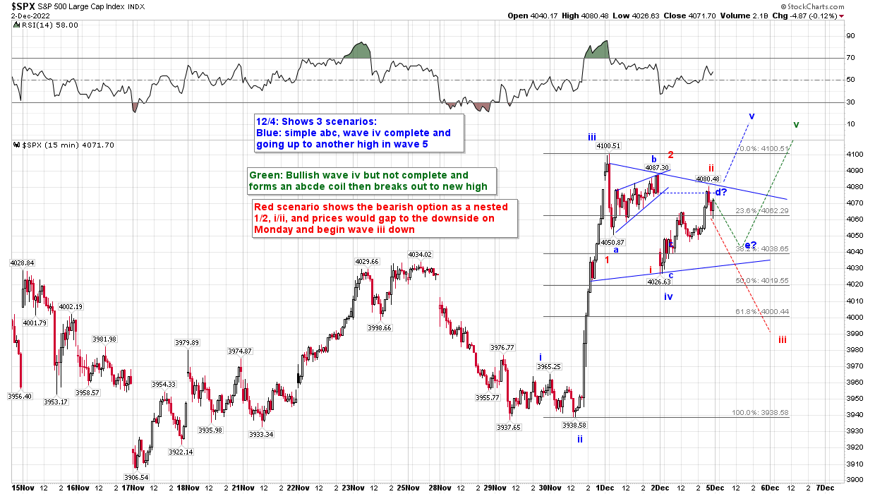 Here's a new 15 min chart, I show 3 scenarios: two short-term bullish ones and one bearish one in Red.