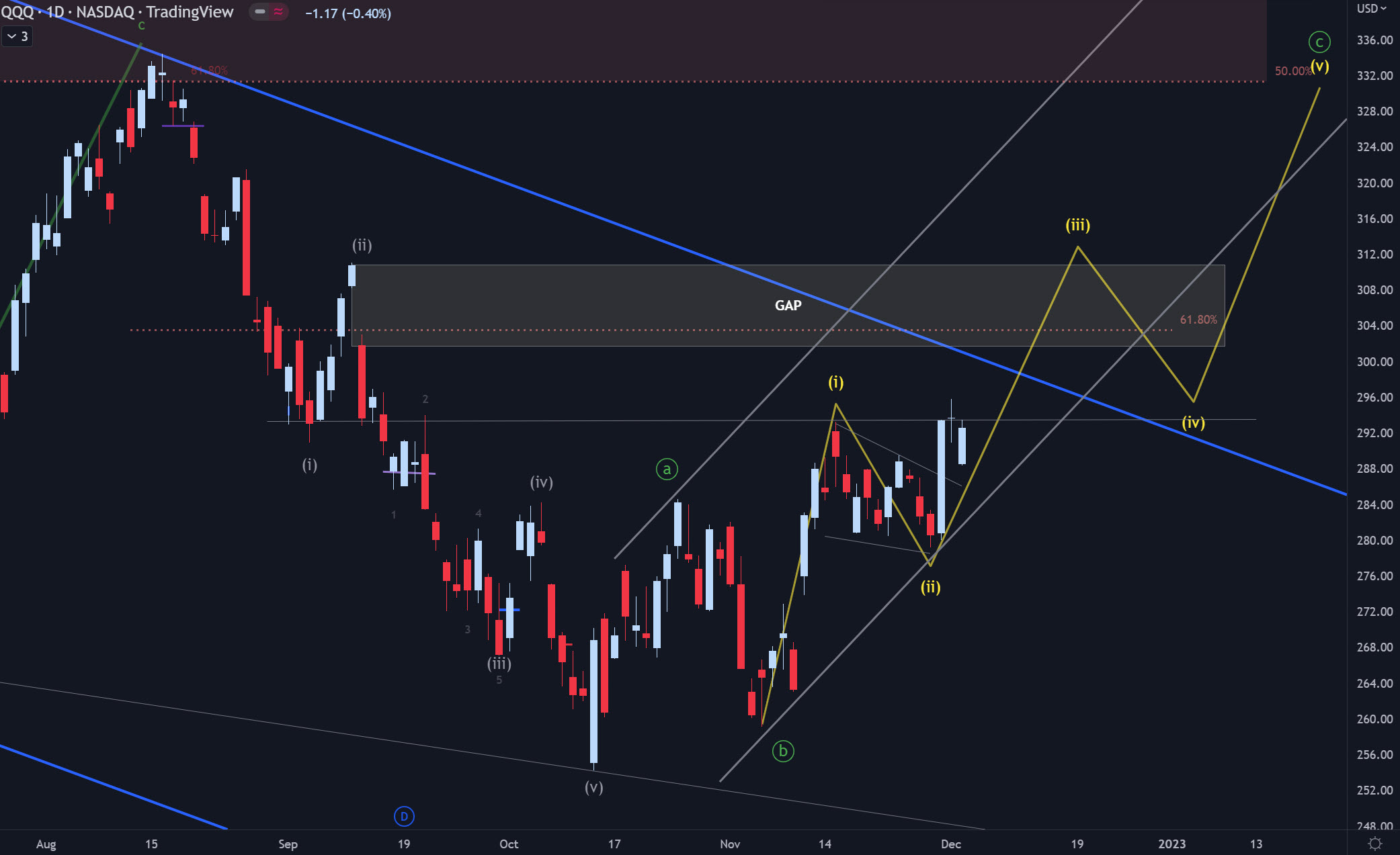 Matt/Steve, your prognostication has been spectacular all year! Really simple to understand parameters. What do you think about this QQQ sceario where we initailly move up to close the gap (that would be a 68% retrace of the mid August move down). I have that as a wave three of this A-B-C move up.
