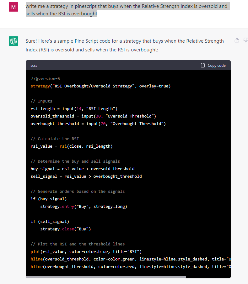 so just doing a crude test of having it write a trading strategy, I wrote something very simple: " write me a strategy in pinescript that buys when the Relative Strength Index is oversold and sells when the RSI is overbought"