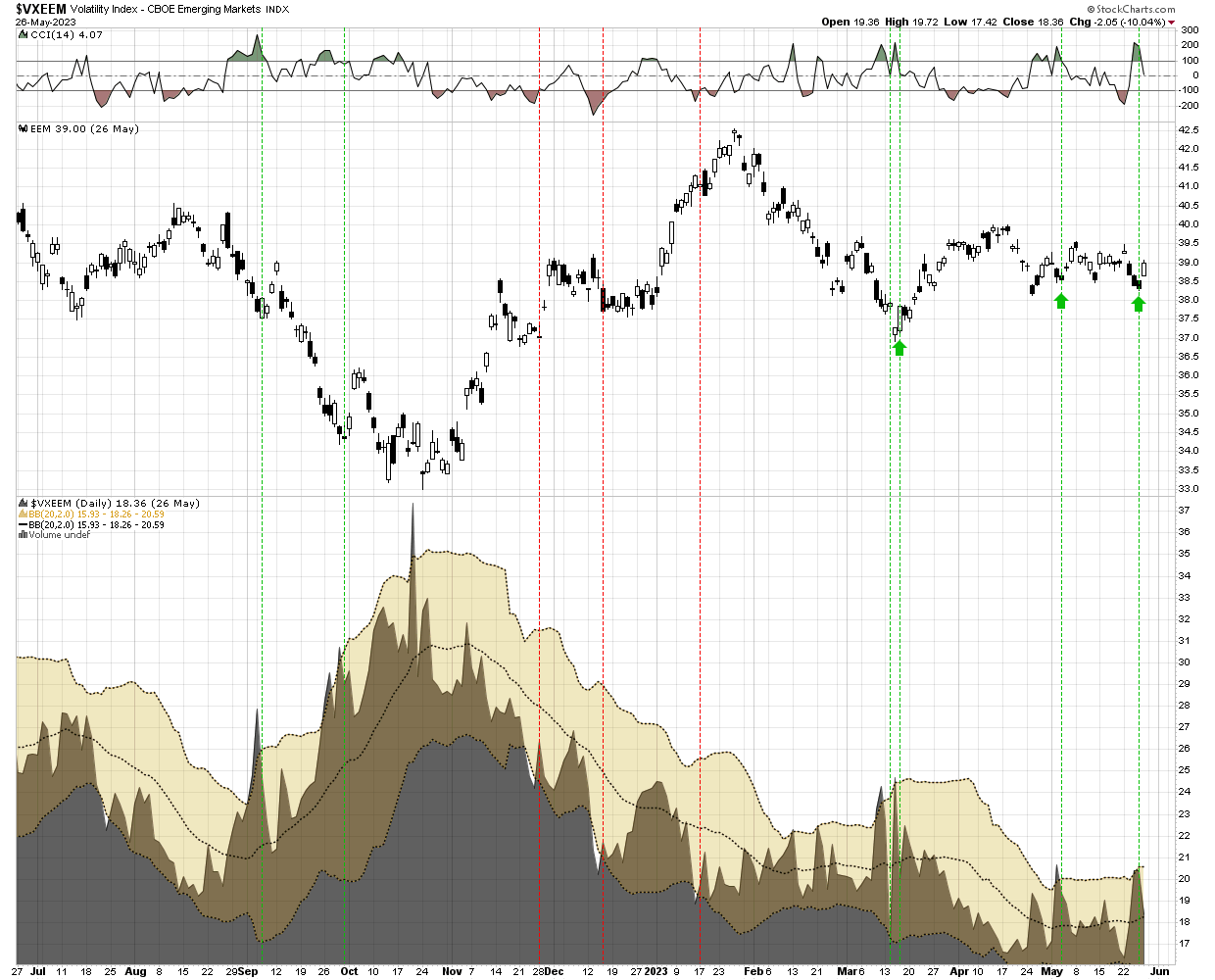 Jason - FYI the EEM Volatility system triggered on Friday with the VXEEM closing back inside the upper BB's