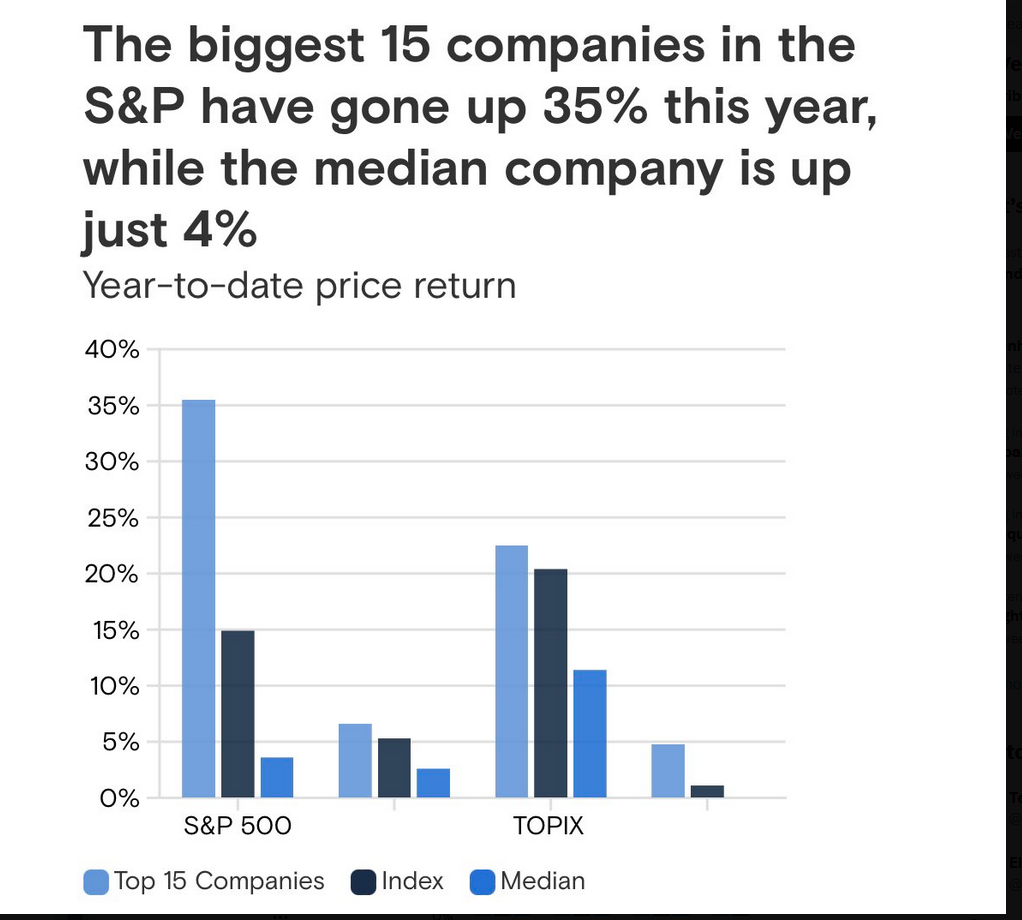 This year, the 15 largest S&P 500 companies are up 35%. Meanwhile, the median S&P 500 company is up just 4%. Yesterday, $MSFTand $NVDA added $175B in market cap. This is more than 462 components of the S&P 500, combined.