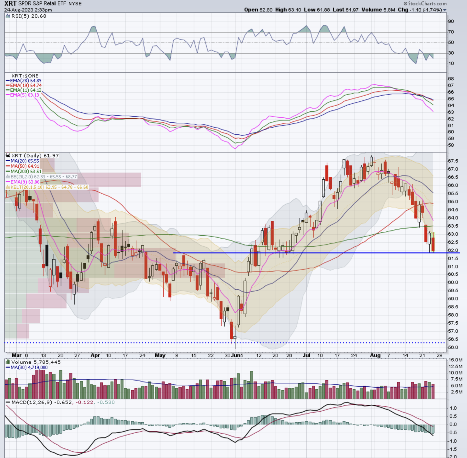 XRT is back down on ledge support. It's holding so far, which is constructive. But it's spent most of three days below the 200 ma, while the 20 is angling down pretty hard and the 50 is turning over.