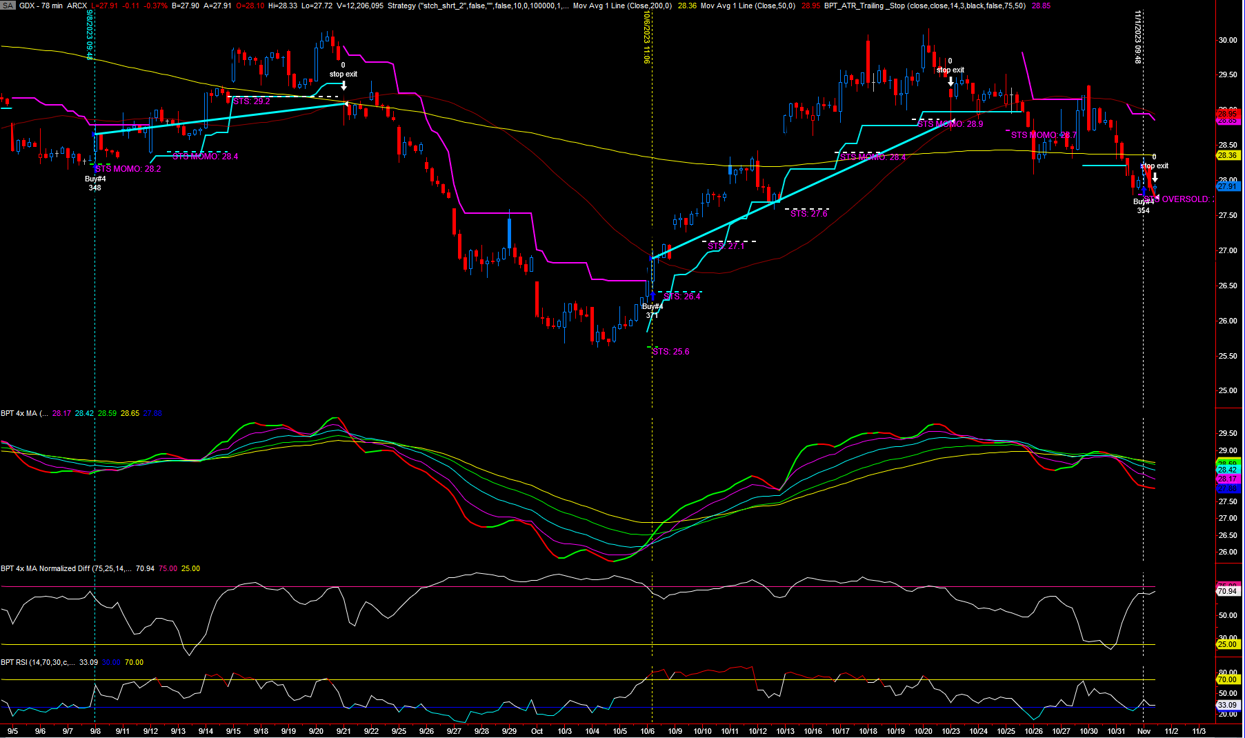 Remember GDX is a bugger for trends therefore a low winning % is normal, because of the nature of GDX it's not easy for a long only trend system. The 78 min and 1/2 day versions were decent. higher time frames like daily were just not adaptable enough because GDX rarely enters uptrends lasting months
