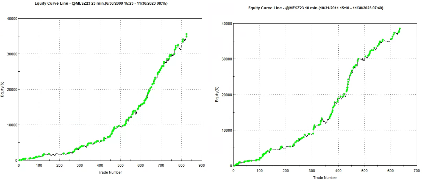 just to show you how this works on pretty much any time frames, here's MES futures on 10 min and 23 min time frames going back to 2010. very nice equity curves.