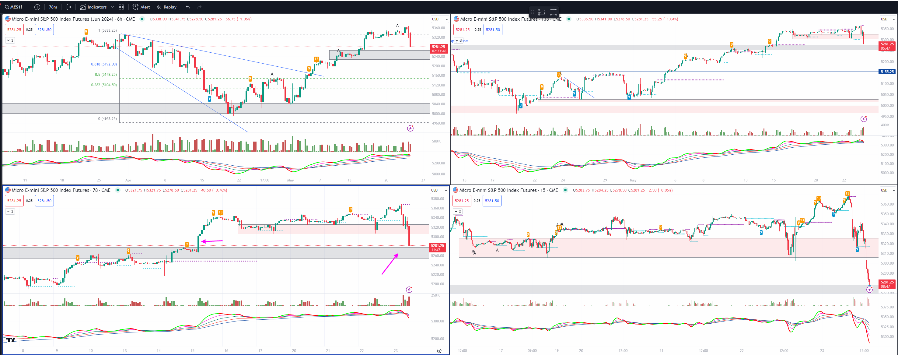 TradingView ES - remember earlier I said if we lost that support around 5305 there was an air pocket to the next support zone range, that's one reason price dumped hard was losing that support, tagging the upper part of that next support zone here at the lows