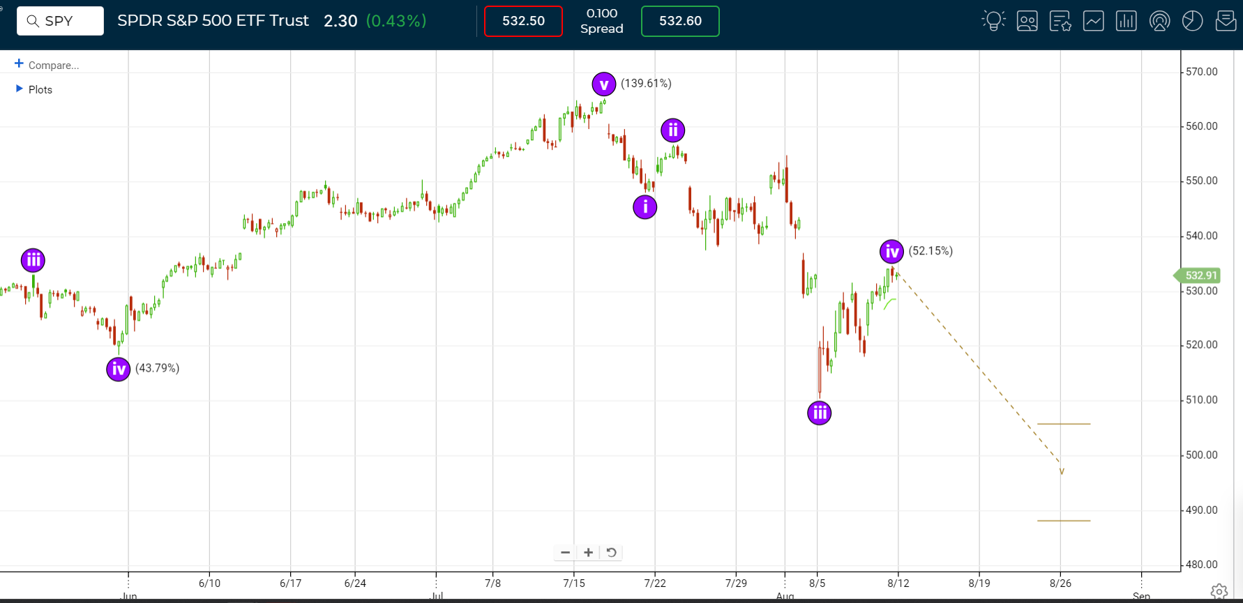 Also, if wave 4 extends (I think is likely), guess about where the 61.8 would fall?