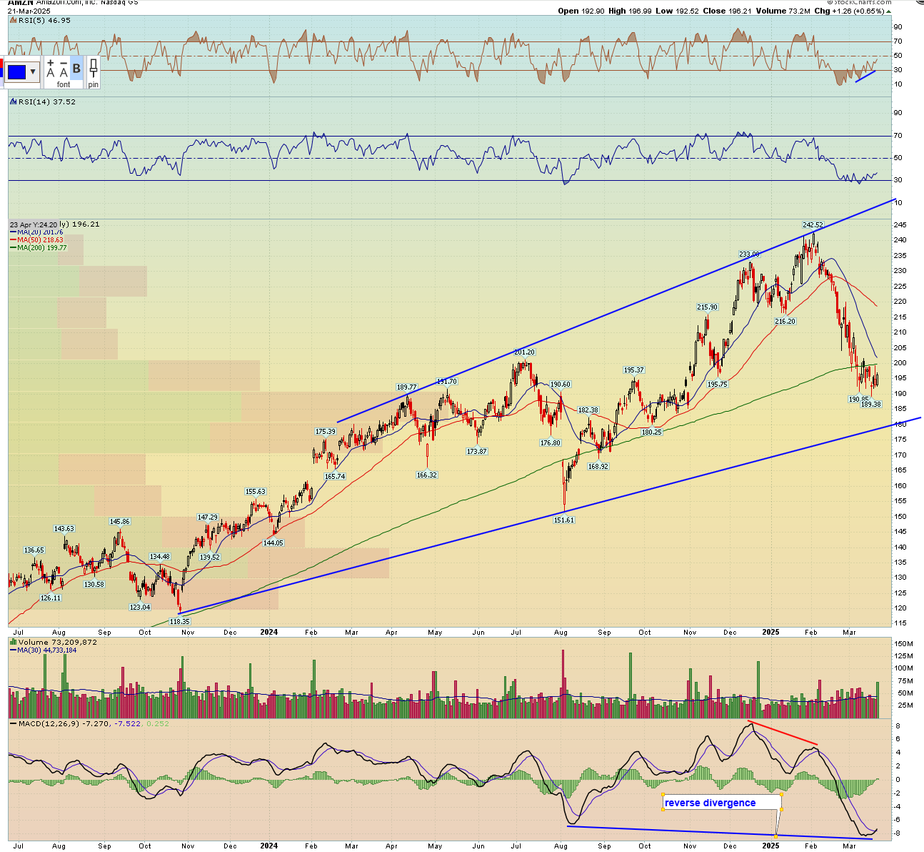 For those who have never Grokked the MACD Crossover, and the MACD Divergence, I put together a discussion, in particular for Amazon. In 2022 there was true MACD Divergence and then a big run up. Now we have a MACD crossover, but also having just bounced out of a trashing of RSI14 oversold. Its at my blog....and a discussion of whether this is a buy, without the divergence, I am thinking of a scale in, give it some room with stop below the trendline, half size position.
