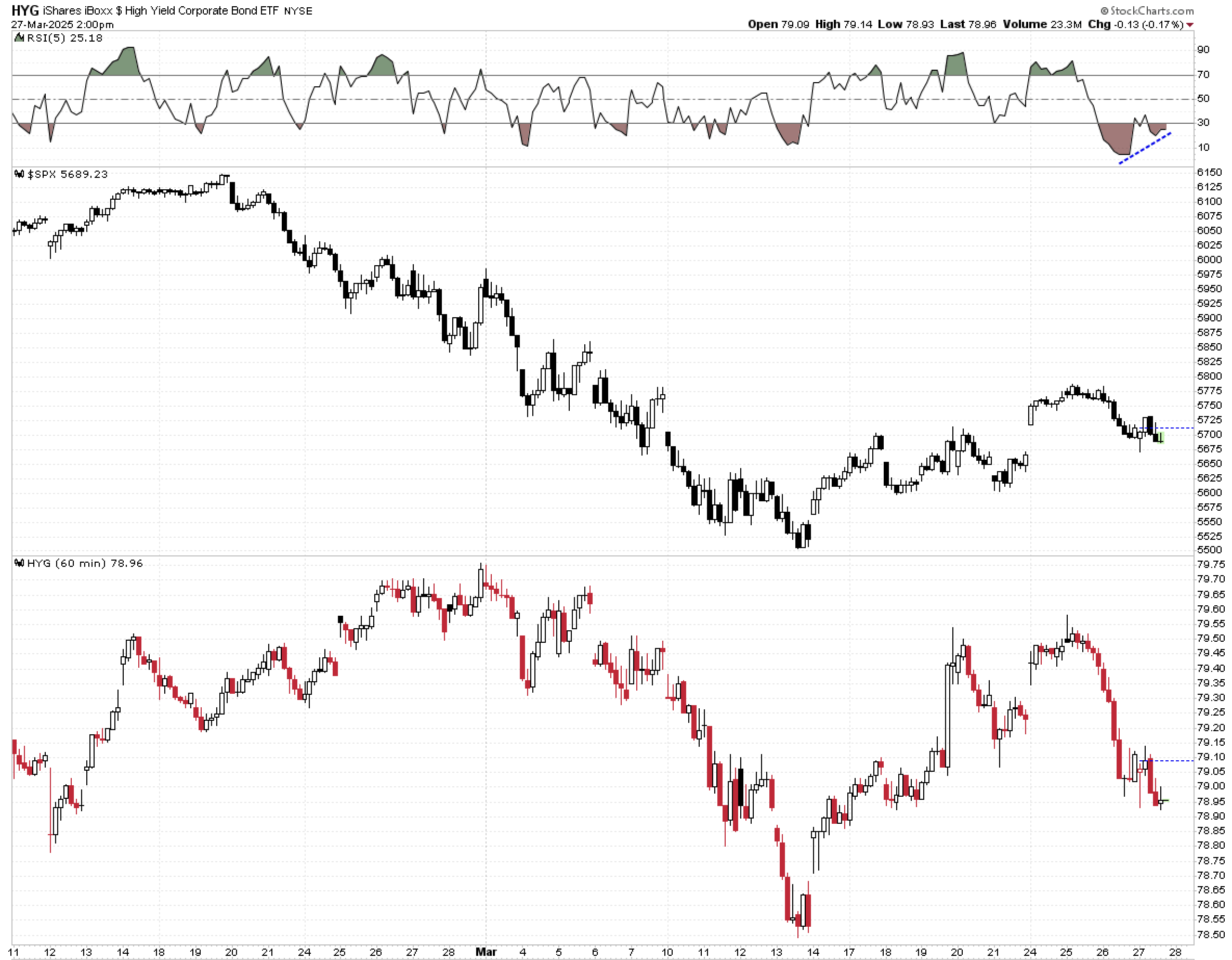 HYG hourly still performing worse than $SPX, but showing a positive divergence on the RSI(5)