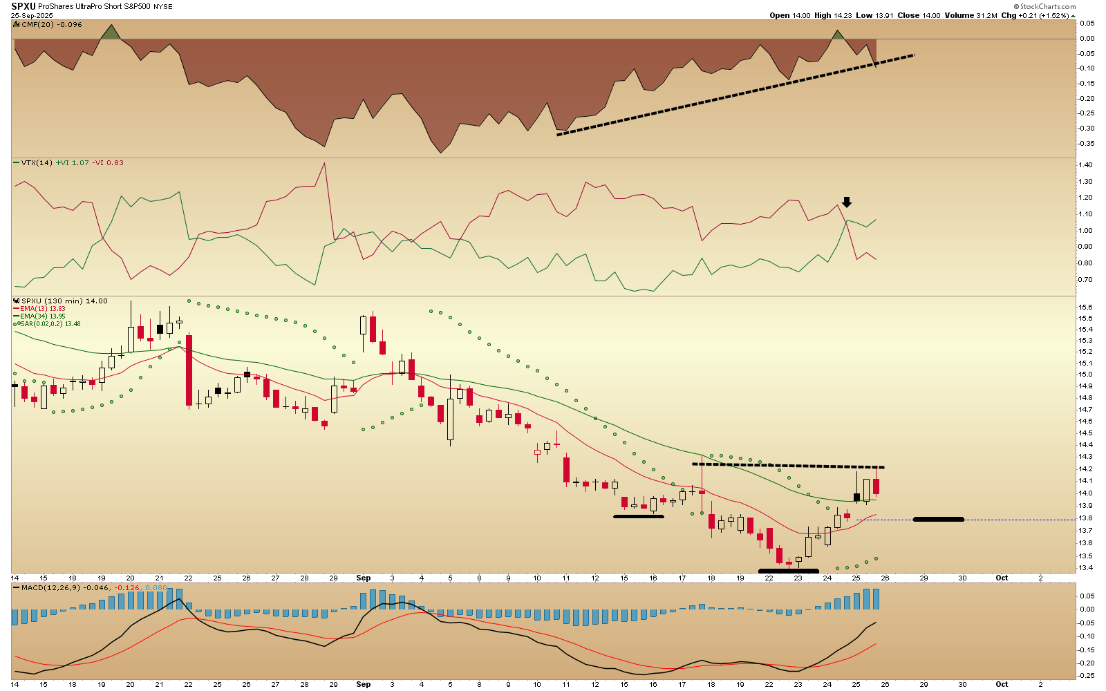 SPXU 130 - pattern emerging. Vortex bull cross, PSAR buy, MACD bull cross, money flow improving.
